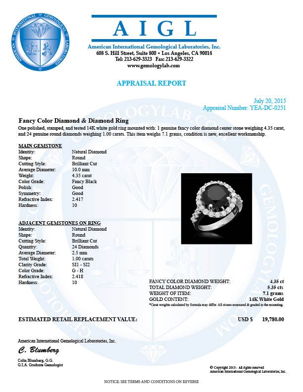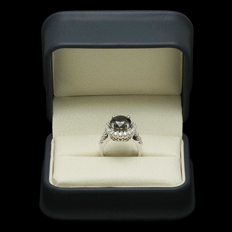 Retail: $19,780.00 ******14k Gold Fancy Color Diamond & Diamond Ring ****** Metal: 14K Solid White Gold / Total Item Weight: 7.1 / Country Made: United States / / Main Stone: Diamond / Color: Fancy Black / Carat Total Weight: 4.35 / Treatment: None / Clarity: Type 2 / Cut: Very Good / / Secondary Stone: Diamond / Carat Total Weight: 3.35 / Treatment: None / Color Grade: G -H / Clarity: SI1 - SI2 / Cut: Round Brilliant /