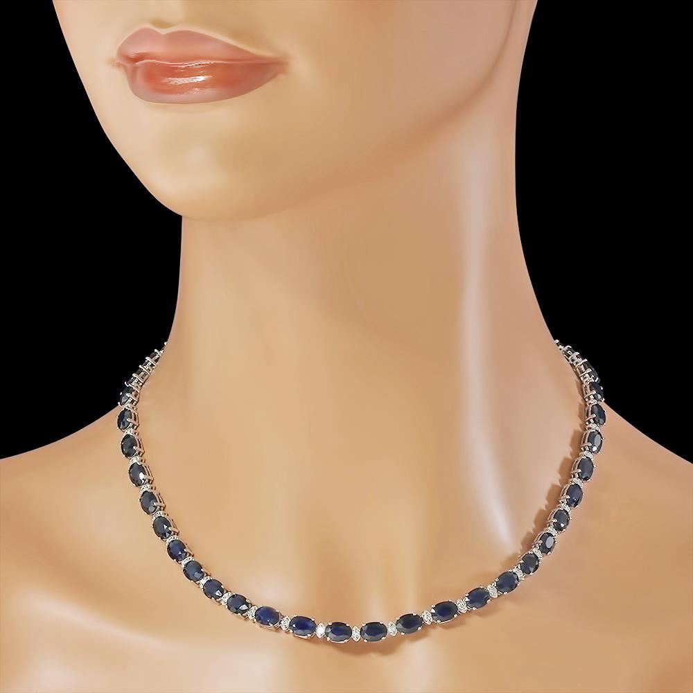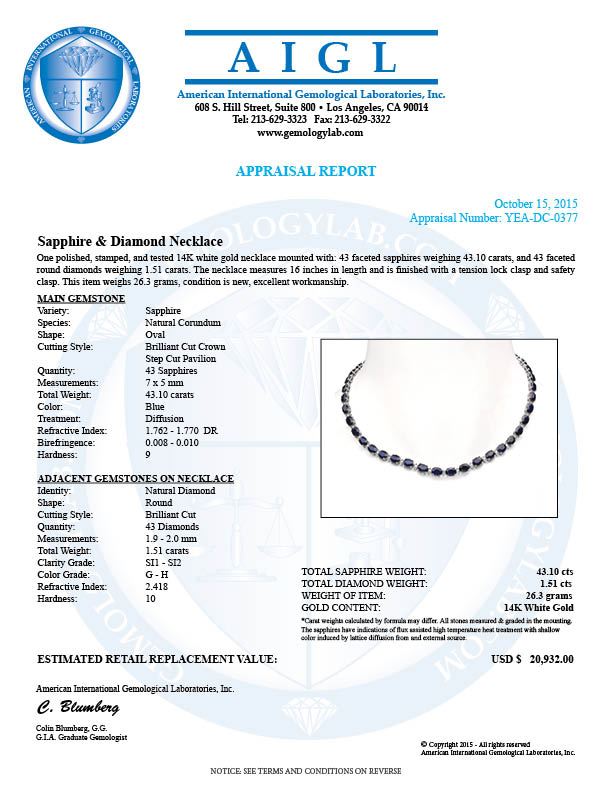 Retail: $20,932.00 ****** 14K Gold 43.10ct Sapphire 1.51ct Diamond Necklace ****** Metal: 14K Solid Gold / Total Item Weight: 26.3 grams / Country Made: United States / / Main Stone: Sapphire / Color: Blue / Carat Total Weight: 43.10 / Treatment: None / Cut: Very Good / / Secondary Stone: Diamond / Carat Total Weight: 1.51 / Treatment: None / Color Grade: G - H / Clarity: SI1 - SI2 / Cut: Round Brilliant /