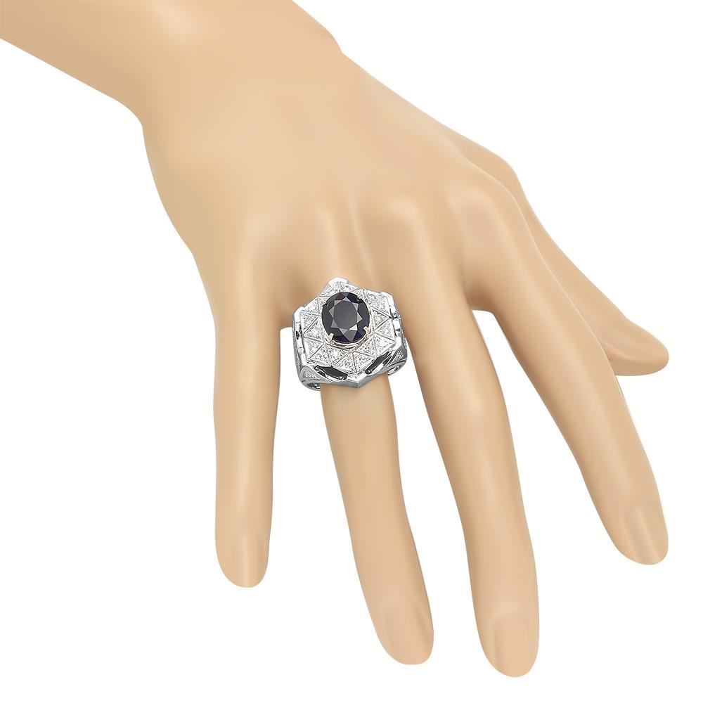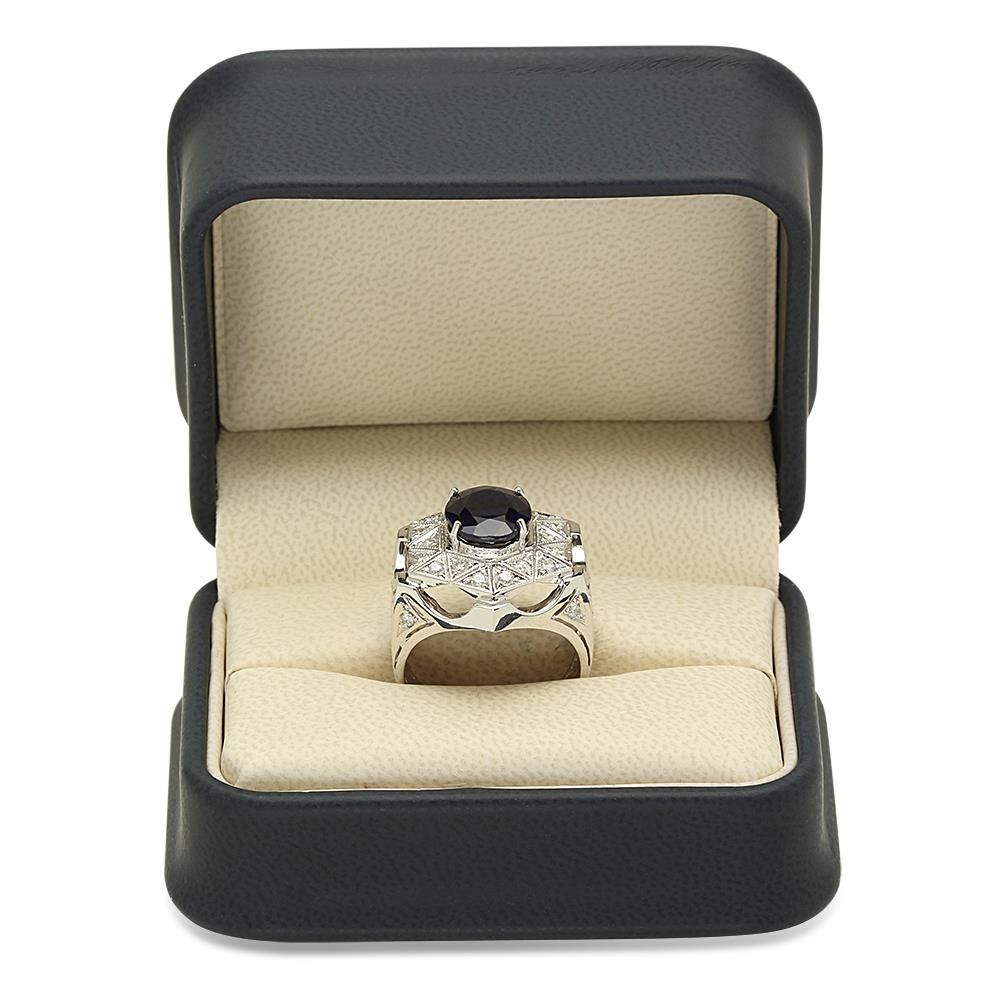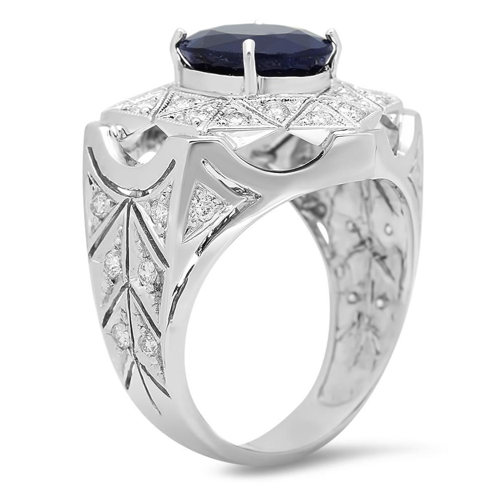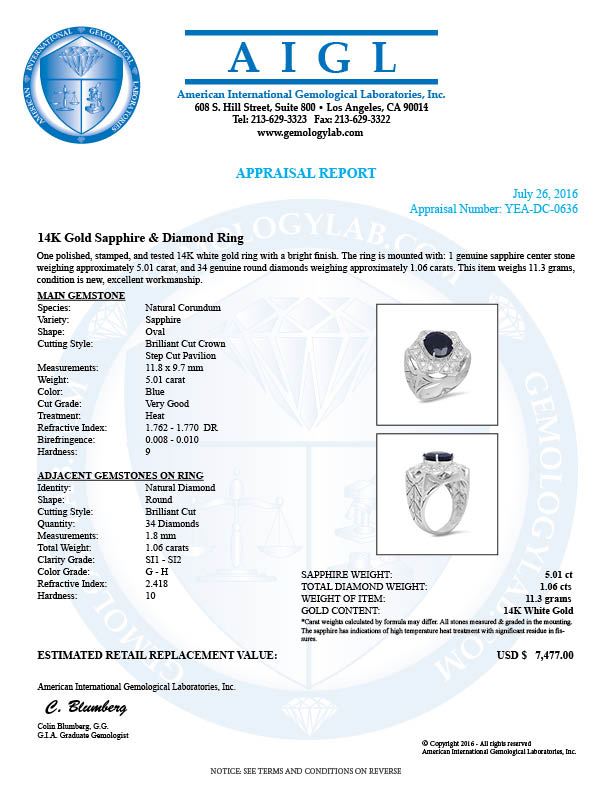 Retail: $7,477.00 ****** 14K Gold 5.01ct Sapphire 1.06cts Diamond Ring ****** Metal: 14K White Gold / Total Item Weight: 11.3 grams / Country Made: United States / Main Stone: Sapphire / Color: Blue / Carat Total Weight: 5.01 / Treatment: Heat / Cut: Very Good / Secondary Stone: Diamond / Carat Total Weight: 1.06 / Treatment: None / Color Grade: G-H / Clarity: SI1 - SI2 / Cut: Round Brilliant /