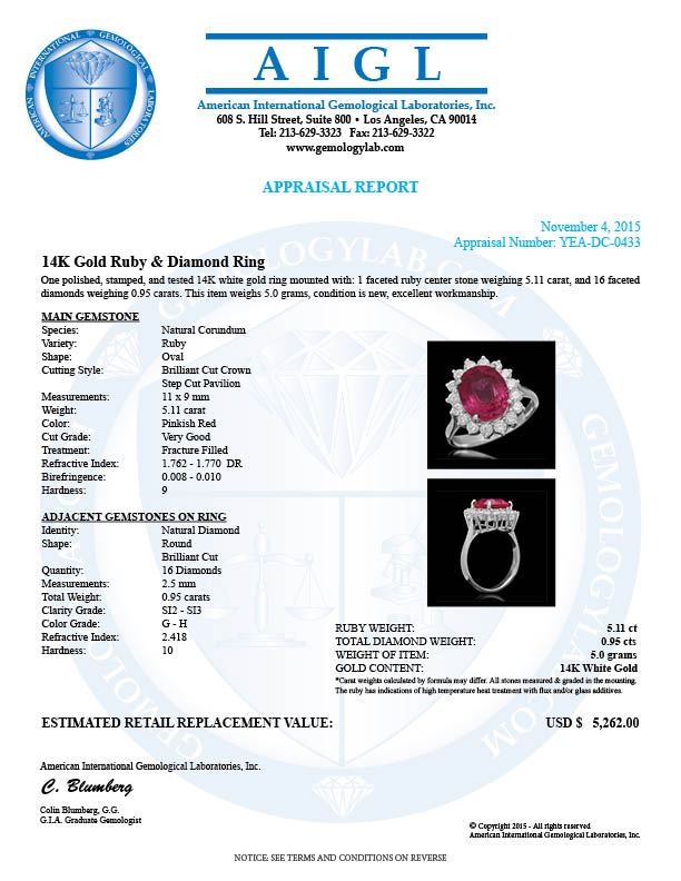 Retail: $5,262.00 ****** 14K Gold 5.11ct Ruby 0.95ct Diamond Ring ****** Metal: 14K Solid Gold / Total Item Weight: 5.0 grams / Country Made: United States / / Main Stone: Ruby / Color: Red / Carat Total Weight: 5.11 / Treatment: None / Cut: Very Good / / Secondary Stone: Diamond / Carat Total Weight: 0.95 / Treatment: None / Color Grade: G - H / Clarity: SI1 - SI3 / Cut: Round Brilliant /