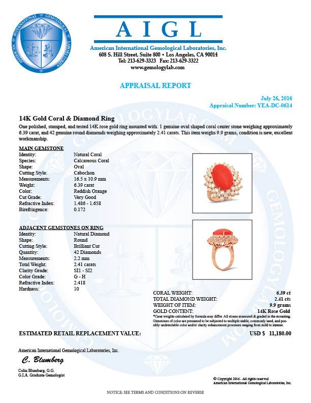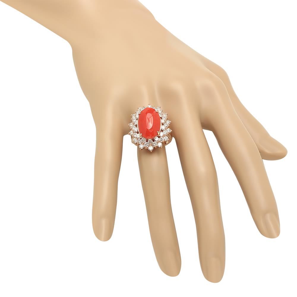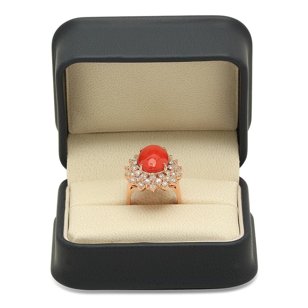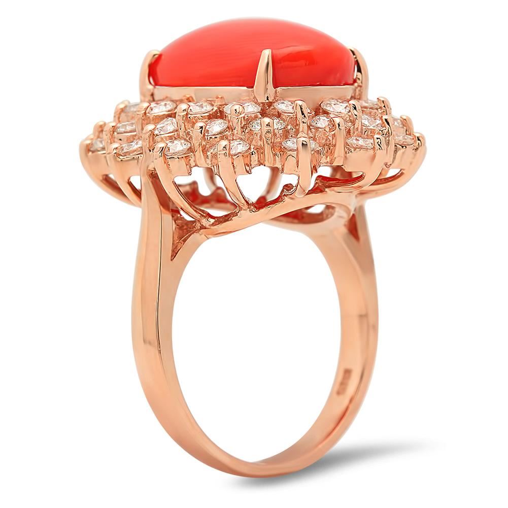 Retail: $11,180.00 ****** 14K Gold 6.39ct Coral 2.41cts Diamond Ring ****** Metal: 14K Rose Gold / Total Item Weight: 9.9 grams / Country Made: United States / / Main Stone: Coral / Color: Reddish Orange / Carat Total Weight: 6.39 / Treatment: None / Cut: Very Good / / Secondary Stone: Diamond / Carat Total Weight: 2.41 / Treatment: None / Color Grade: G-H / Clarity: SI1 - SI2 / Cut: Round Brilliant /