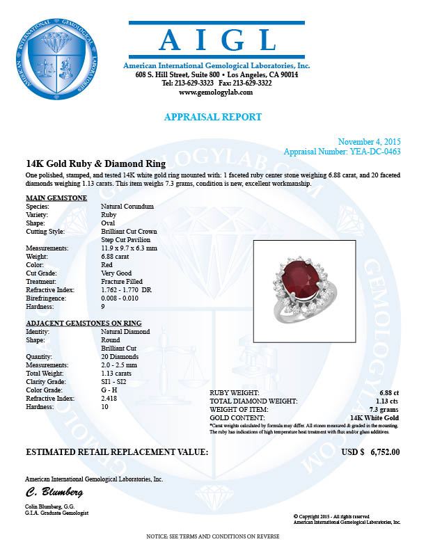 Retail: $6,752.00 ****** 14K Gold 6.88ct Ruby 1.13ct Diamond Ring ****** Metal: 14K Solid Gold / Total Item Weight: 7.3 grams / Country Made: United States / / Main Stone: Ruby / Color: Red / Carat Total Weight: 6.88 / Treatment: None / Cut: Very Good / / Secondary Stone: Diamond / Carat Total Weight: 1.13 / Treatment: None / Color Grade: G - H / Clarity: SI1 - SI2 / Cut: Round Brilliant /