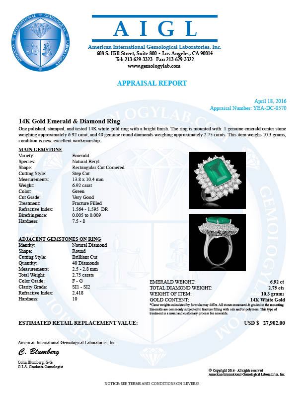 Retail: $27,902.00 ****** 14K Gold 6.92 Emerald 2.75 Diamond Ring ****** Metal: 14K Solid Gold / Total Item Weight: 10.3 grams / Country Made: United States / / Main Stone: Emerald / Color: Green / Carat Total Weight: 6.92 / Treatment: None / Cut: Very Good / / Secondary Stone: Diamond / Carat Total Weight: 2.75 / Treatment: None / Color Grade: F - G / Clarity: SI1 - SI2 / Cut: Round Brilliant /