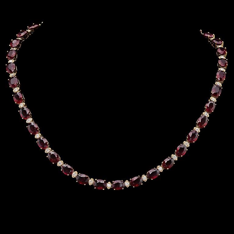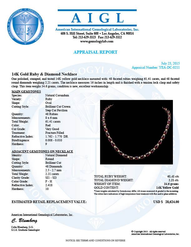 Retail: $28,624.00******14K Gold Ruby & Diamond Necklace****** Metal: 14K Solid Gold / Total Item Weight: 34.6 grams/ Country Made: United States / / Main Stone: Ruby / Color: Red / Carat Total Weight: 61.41 / Treatment: None / Clarity: Type 2 / Cut: Very Good / / Secondary Stone: Diamond / Carat Total Weight: 2.21 / Treatment: None / Color Grade: F - H / Clarity: SI1 - SI3 / Cut: Round Brilliant /