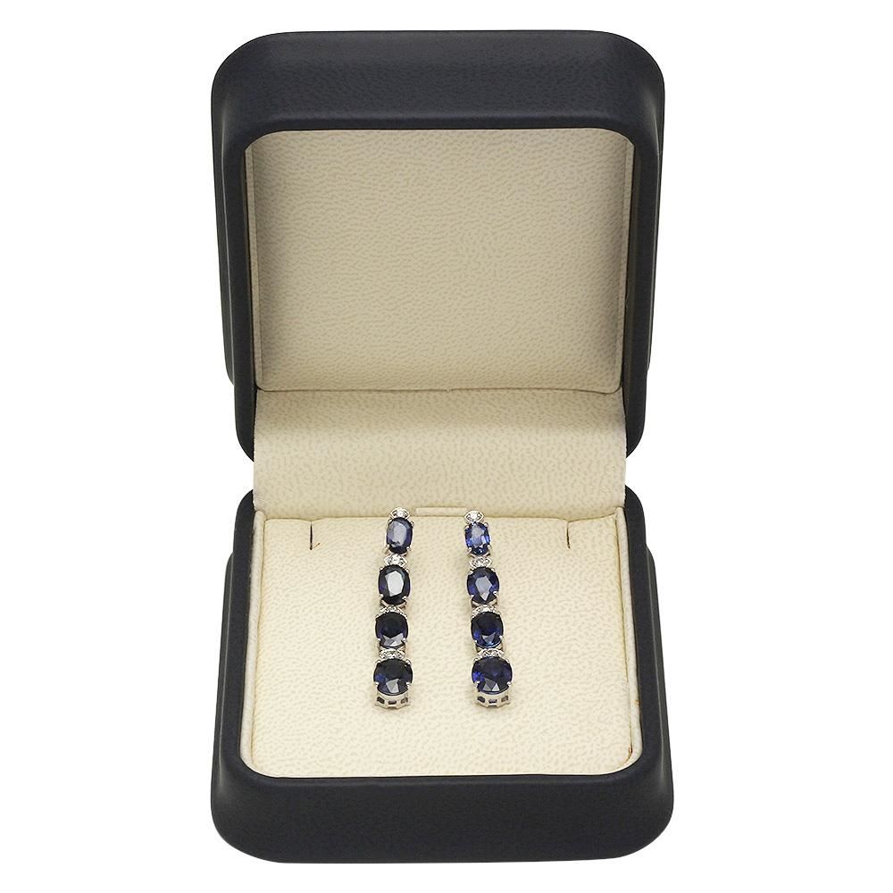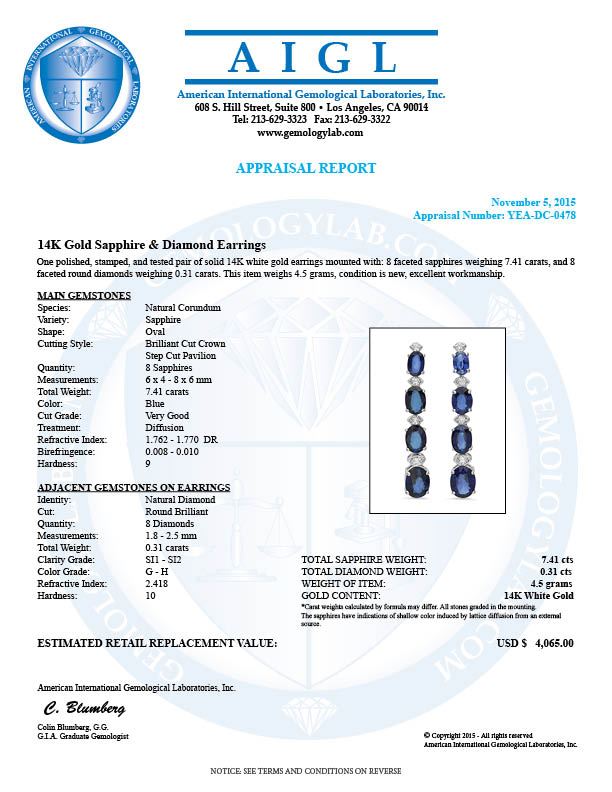 Retail: $4,065.00 ****** 14K Gold 7.41ct Sapphire 0.31ct Diamond Earrings ****** Metal: 14K Solid Gold / Total Item Weight: 4.5 grams / Country Made: United States / / Main Stone: Sapphire / Color: Blue / Carat Total Weight: 7.41 / Treatment: None / Cut: Very Good / / Secondary Stone: Diamond / Carat Total Weight: 0.31 / Treatment: None / Color Grade: G - H / Clarity: SI1 - S13 / Cut: Round Brilliant /