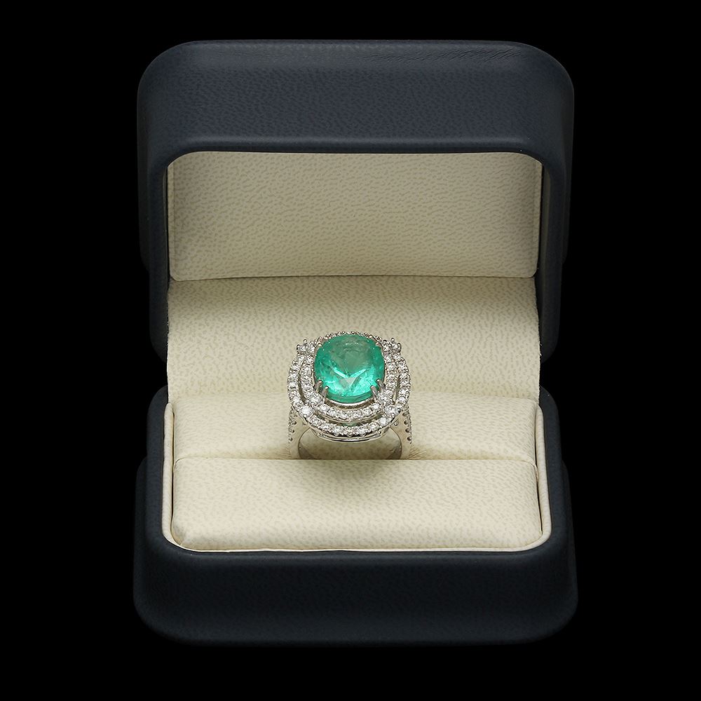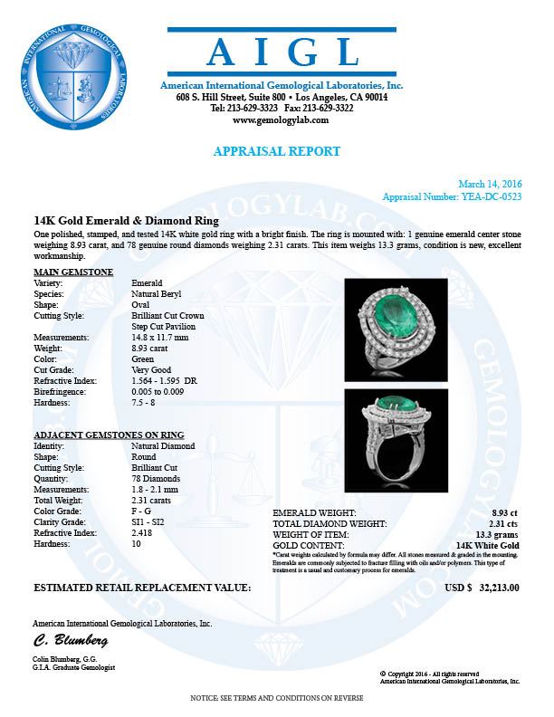 Retail: $32,213.00 ****** 14K Gold 8.93ct Emerald 2.31ct Diamond Ring ****** Metal: 14K Solid Gold / Total Item Weight: 13.3 grams / Country Made: United States / / Main Stone: Emerald / Color: Green / Carat Total Weight: 8.93 / Treatment: None / Cut: Very Good / / Secondary Stone: Diamond / Carat Total Weight: 2.31 / Treatment: None / Color Grade: F - G / Clarity: SI1 - SI2 / Cut: Round Brilliant /