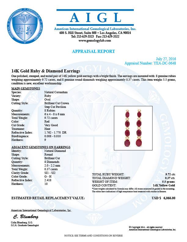 Retail: $6,066.00 ****** 14K Gold 9.72ct Ruby 0.37cts Diamond Earrings****** Metal: 14K Yellow Gold / Total Item Weight: 5.5 grams / Country Made: United States / Main Stone: Ruby / Color: Red / Carat Total Weight: 9.72 / Treatment: Heat / Cut: Very Good / Secondary Stone: Diamond / Carat Total Weight: 0.37 / Treatment: None / Color Grade: G-H / Clarity: SI1 - SI2 / Cut: Round Brilliant /
