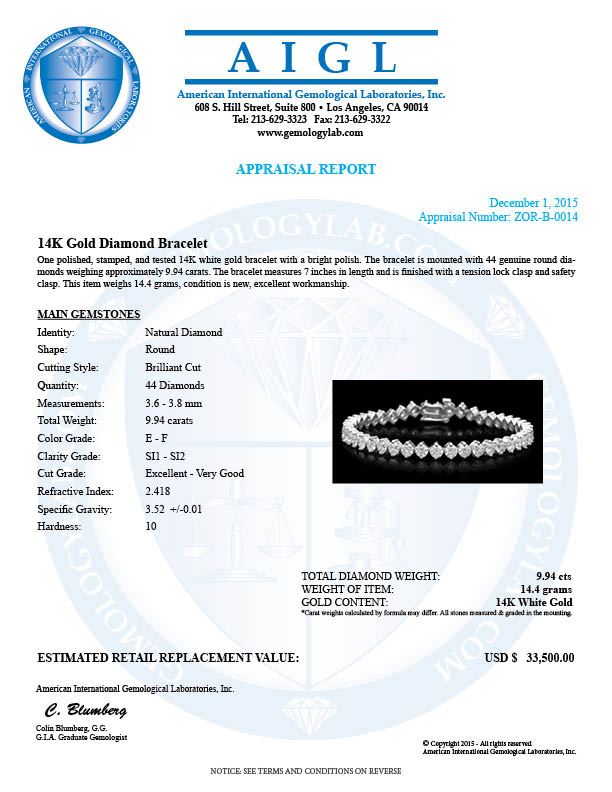 Retail: $33,500.00 ****** 14K Gold 9.94ct Diamond Bracelet ****** Metal: 14K Solid Gold / Total Item Weight: 14.4 grams / Country Made: United States / / Main Stone: Diamond / Carat Total Weight: 9.94 / Treatment: None / Cut: Very Good / Color Grade: E - F / Clarity: SI1 - SI2 / Cut: Round Brilliant /