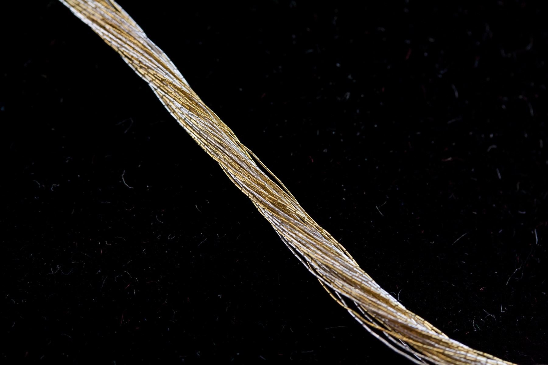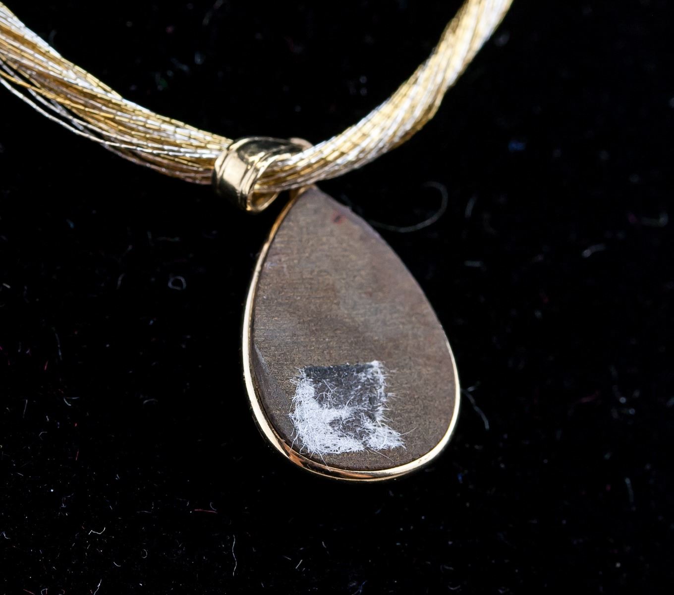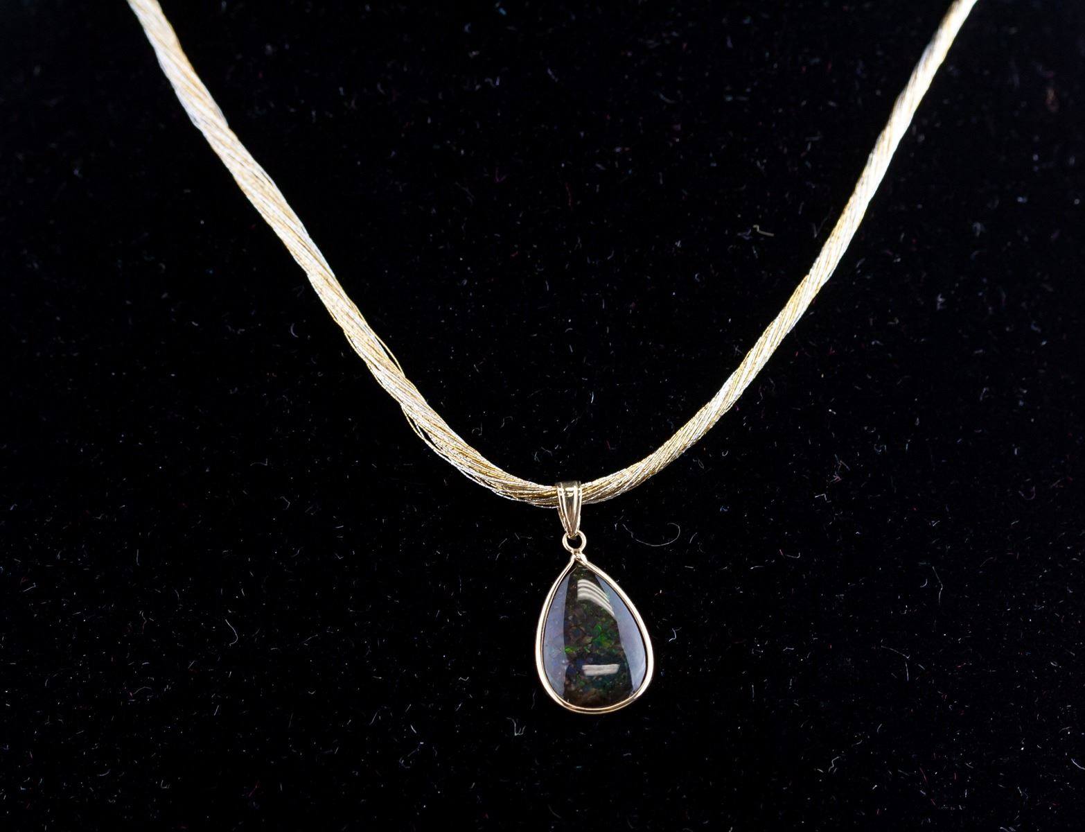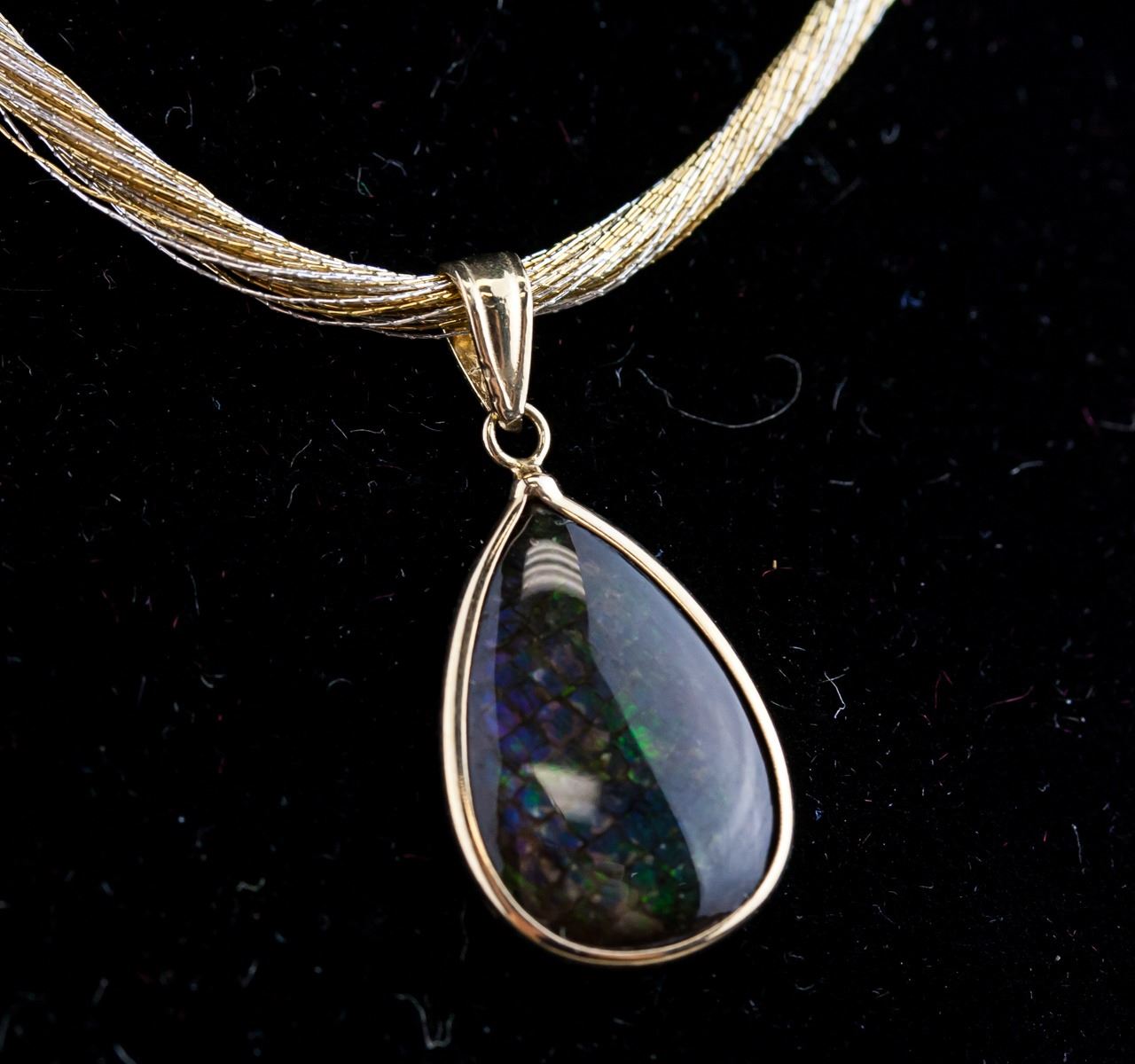 Stamped 14k yellow gold pendant, with fancy chord. Set with greenish black, custom cut, ammolite. Retail value $800.