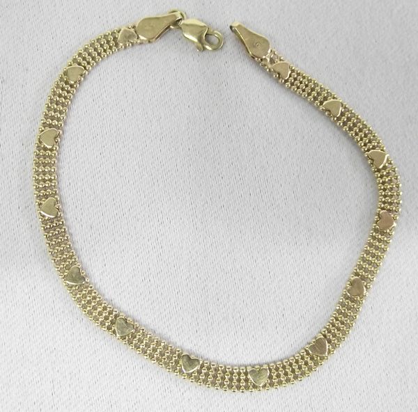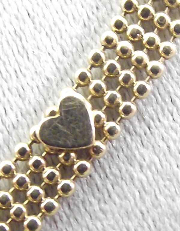 14K Gold Ball Mesh Bracelet. Charming bracelet with hearts on top of tiny ball mesh gold bracelet. Lobster claw clasp with ''14Kt'' stamped on it. Measures 7-1/8''L x 3/16''W. Weighs 0.115oz, 0.105ozt,3.2 gram.