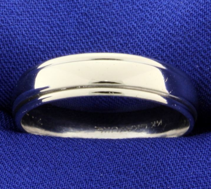 This 14K white gold ring is 5.9mm wide and has "7-21-07" engraved on the inside of the shank. Size 13 1/2 7.1g
