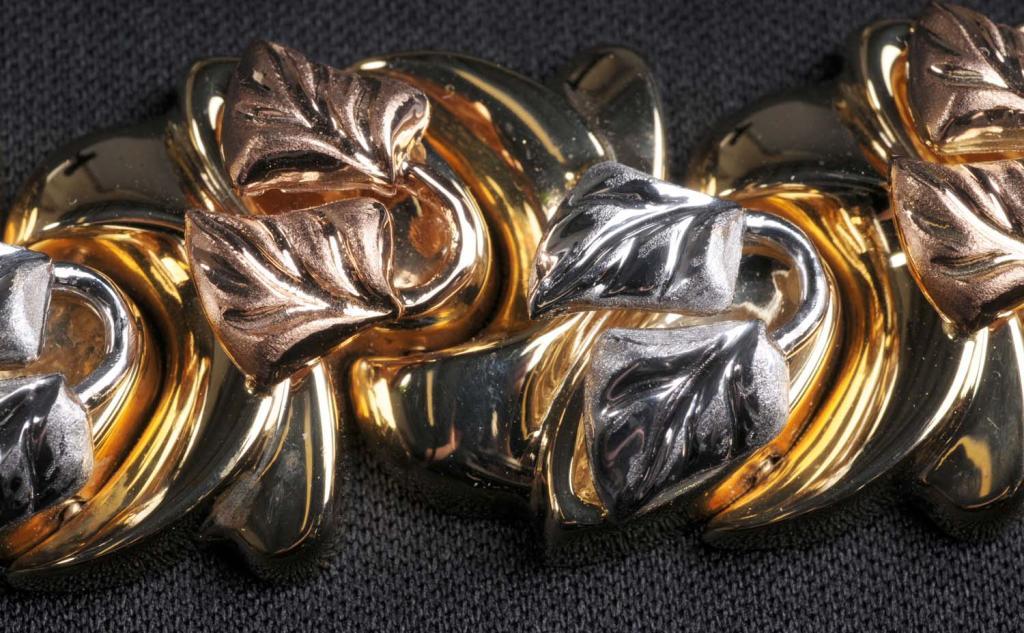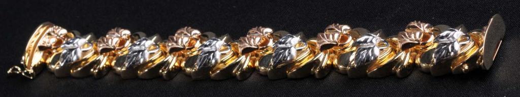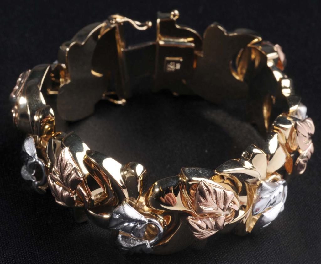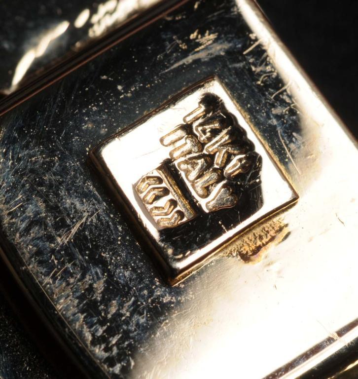 Description Italian. Yellow and white gold with makers hallmarks. Condition (Excellent). Size 7 - 1/2" x 1".