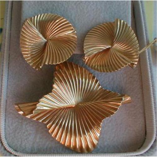 </font></strong>Sophisticated Demi parure brooch and earrings set. Discs of pleated