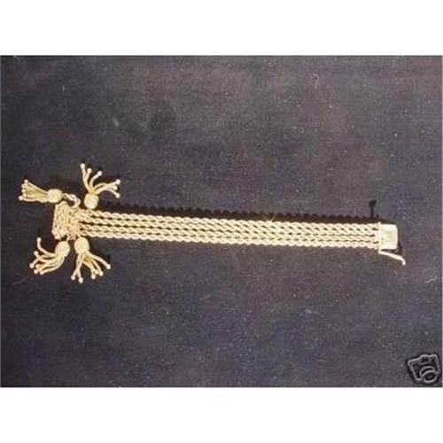 14K Gold C signed Rope Twisted Bracelet - 7 14" long. Very attractive heavy gold bracelet with 4 beautifully twisted rope chains each terminating with 6 tassled stylized pineapple finials. Very well designed closure with safety clasp. Excellent condition. With an old postage scale with which I've never weighed jewelry for sale, the bracelet appears to weigh about 1 1/2 oz. but I can't guarantee its accuracy & I don't have a pennyweight scale. Shipping cost will be the USPS estimate + insurance to be sent in invoice after auction ends.