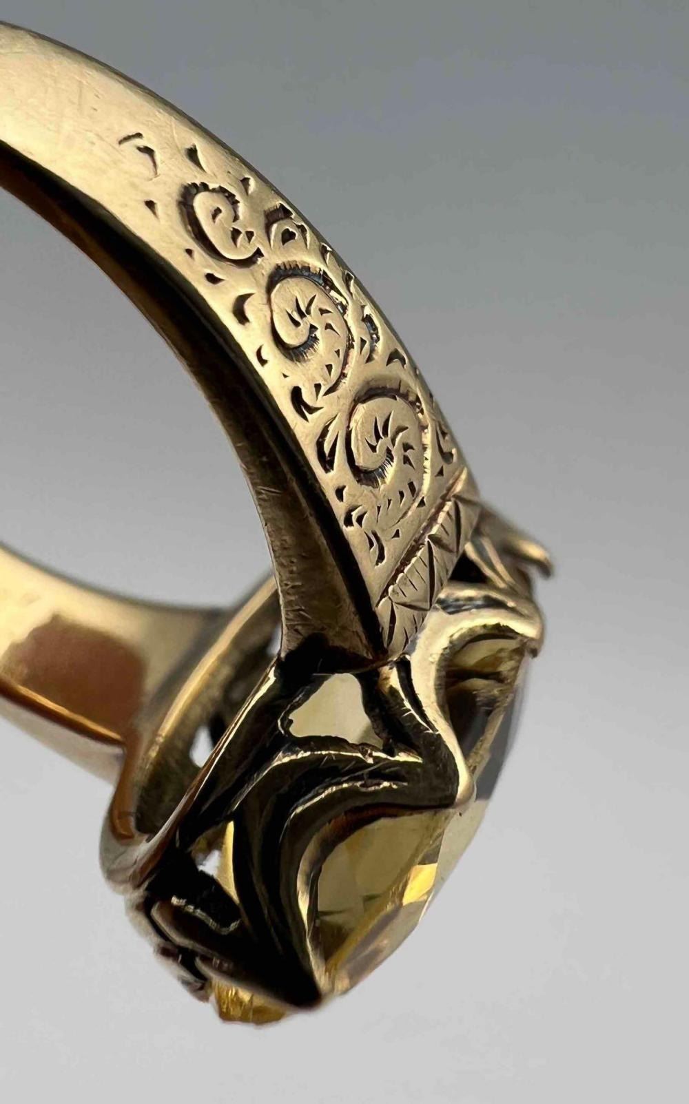 14K Gold Citrine Ring With Engraved Detail On Band. 4.1g. Unmarked, Tests As 14K. Stone Is Currently Slightly Loose In Setting & scratched. Stone Approximately 12.1L x 8.4W mm. Ring Size 4.75. ALL CREDIT CARDS WILL BE MANUALLY VERIFIED PRIOR TO SHIPMENT.