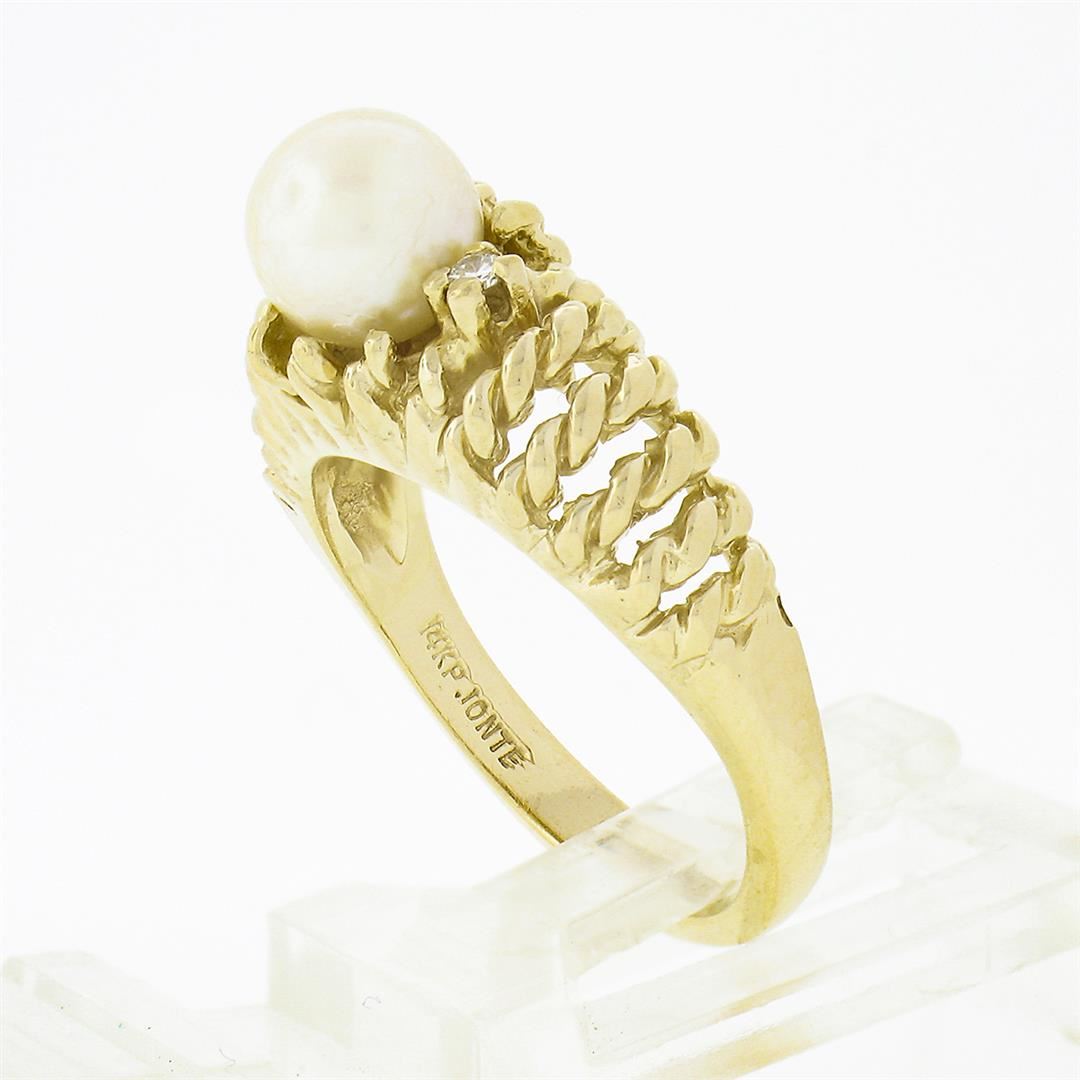 A solid 14k yellow gold ring, with 1 round shape cultured pearl (6.3mm), and 2 round brilliant cut natural diamonds (G/H - VS2/SI1 ; 0.04ctw). The ring is size 6.0, weighs a total of 4.66 grams, and measures 8.10mm wide.