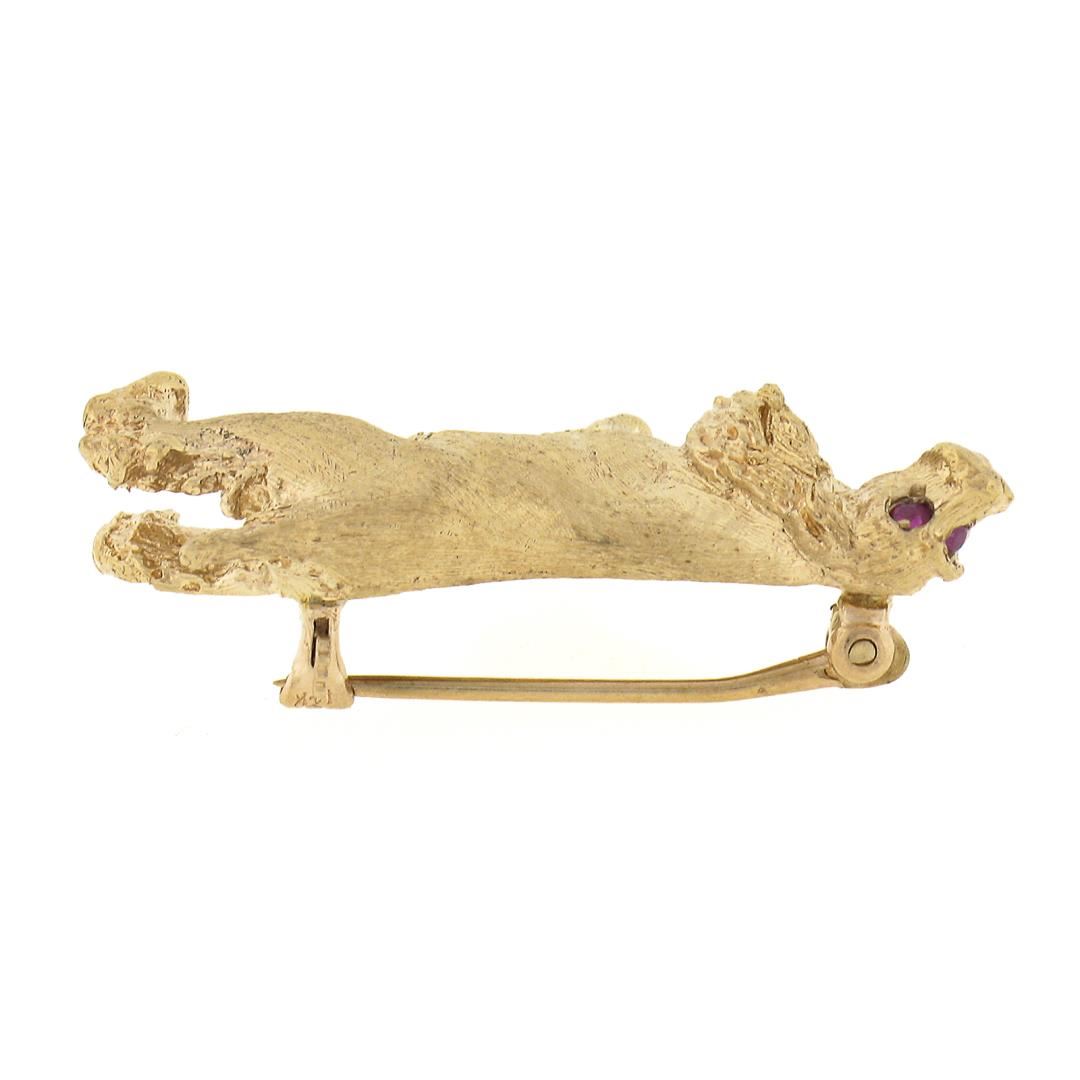 A solid 14k yellow gold dog brooch, with 2 round cut natural rubies (0.04ctw). Measures 27.4x22mm and weighs a total of 9.42 grams.
