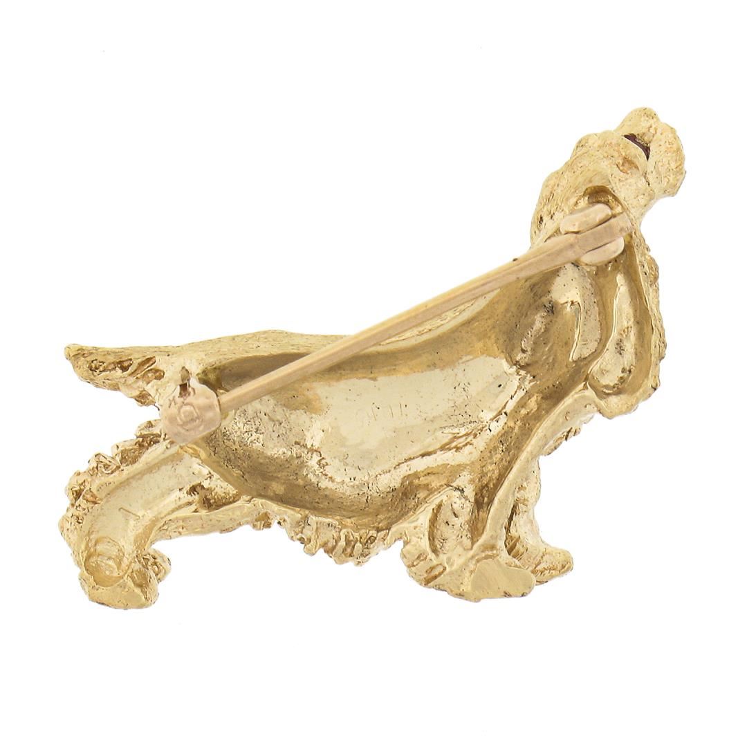 A solid 14k yellow gold dog brooch, with 2 round cut natural rubies (0.04ctw). Measures 27.4x22mm and weighs a total of 9.42 grams.