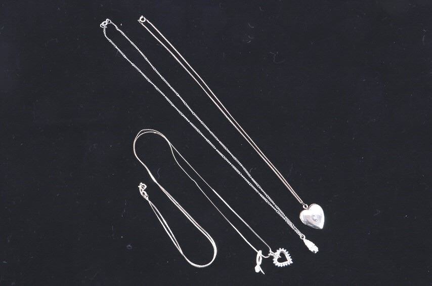 Offered in this lot is a collection of three necklaces and four pendants of 14K gold and diamonds. The first is a 3.4-gram nugget of gold marked 14K. This nugget is highly polished. The chain is not marked or tested but appears to be 14K gold; it is 20" long and the nugget weighs 5.3 grams. The next necklace has a heart locket pendant with a diamond on the cover, circa 1930-1940. The locket opens for photos and has a diamond on the cover. The locket weighs 4 grams and is marked inside, “10k”. The chain is not marked or tested and is 16" long and matches the locket; together, they weigh 5.4 grams. The last necklace has two pendants, one open heart shaped with twenty small diamonds. The second pendant is in a ribbon shape with one large diamond and six smaller diamonds on a 14k gold marked, 30", flat "S" chain. The total weight of this necklace with pendants is 5.5 grams. These necklaces are all in sturdy condition. At current gold value, this lot has a value of $413.