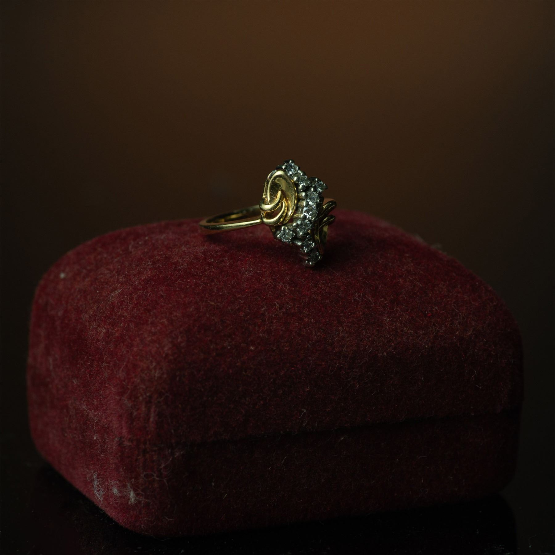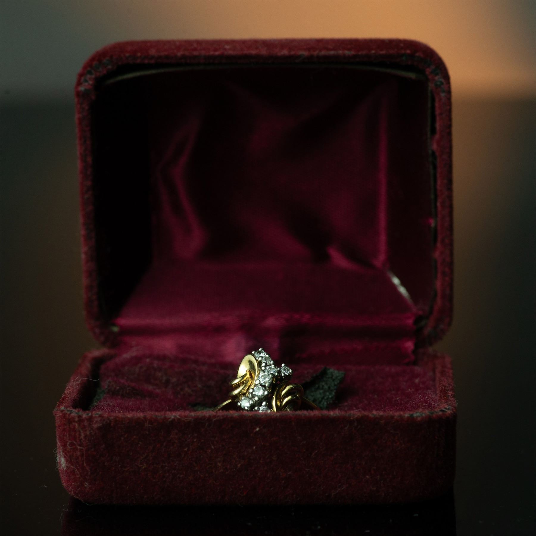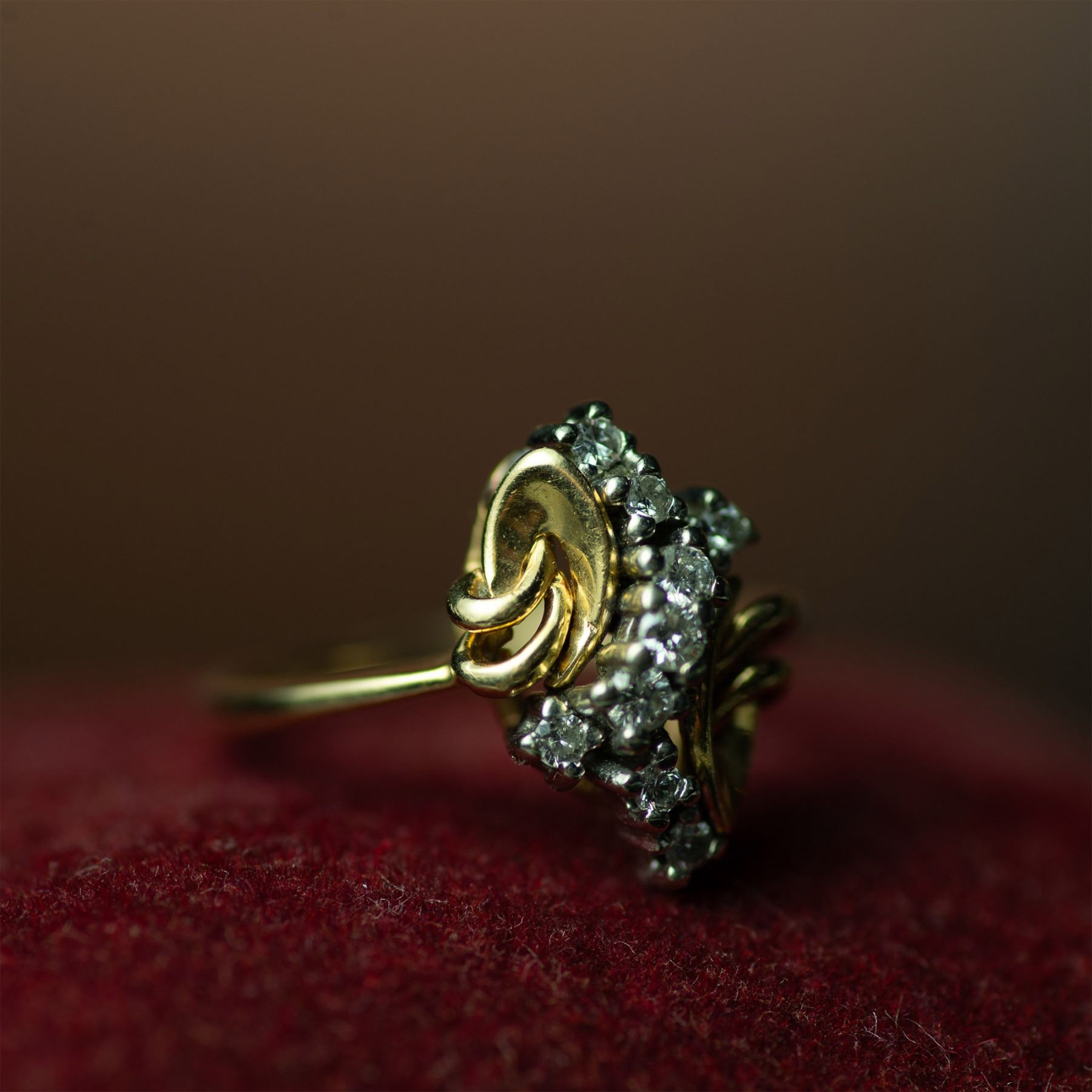 Elegant 14K gold diamond cluster ring Sz. 6.5, featuring a sculptural bypass design with multiple round-cut diamonds set in a raised prong setting. The ring showcases a delicate and graceful arrangement, with the gold band curving around the diamond cluster, creating a fluid and dynamic aesthetic. The diamonds add brilliance and sparkle to the piece, making it a sophisticated choice for any occasion. Diamonds are SI-1 quality weighting 0.30ct.