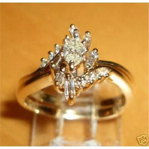 <P>Up for auction is this gorgeous ladies diamond engagement ring and matching wedding ring/wrap set. This engagement ring is set with one gorgeous genuine, natural Marquise Brilliant Diamond in the center. This diamond is H color, SI1 clarity and weighs .20 carat. There are also eight genuine Round Brilliant Diamonds and six natural Baguette Diamonds set in both the engagement ring and the wedding ring guard. These diamonds are H color, SI/VS clarity and weigh a total of .23 carat. Both of these rings are 14KT Yellow Gold, weigh a total of 5.1 grams and are a finger size 6 1/2, can be easily resized. These rings are brand new and will be accompanied by an appraisal by a GIA Certified Diamond Grader with the retail replacement value of $1,479.00. I will ship these rings promptly in a beautiful gift box. Good Luck with these great deals.</P>
