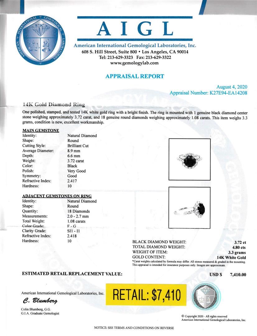 14K Gold Diamond Ring. Please see Photos and Description for all available information. This stunning diamond ring is set in a 14K white gold band and features a large 3.72 ct black diamond surrounded by 1.08 cts of smaller diamonds. The black diamond helps to add depth and character to the ring, as well as a touch of mystery. The smaller diamonds add sparkle, making this a one-of-a-kind ring.