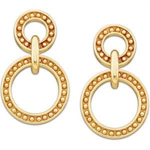Stunning 14k Yellow Gold Earrings featuring a 'beaded circle' dangling from a smaller 'beaded circle'. The Earrings have 14k Gold post style backs for pierced ears.