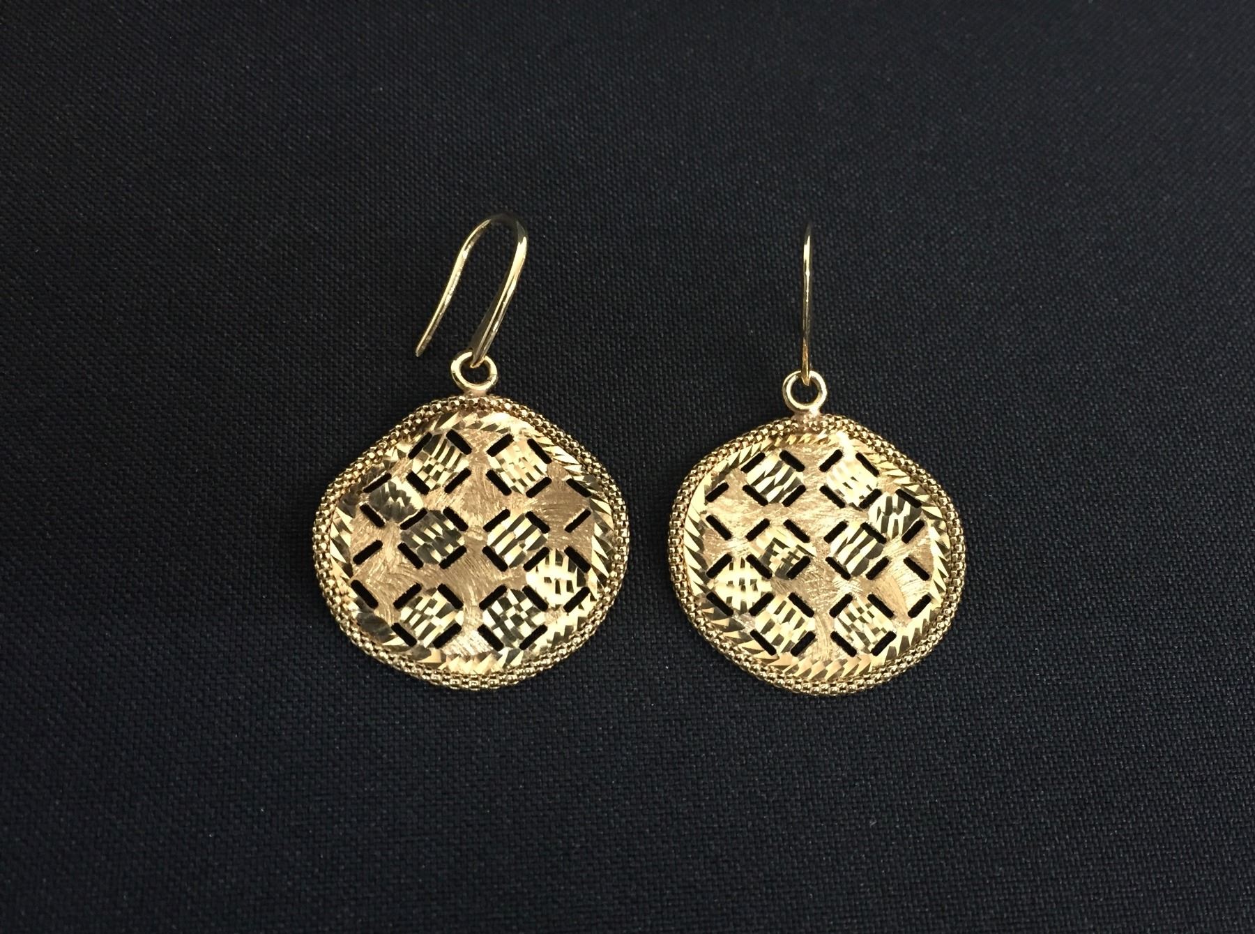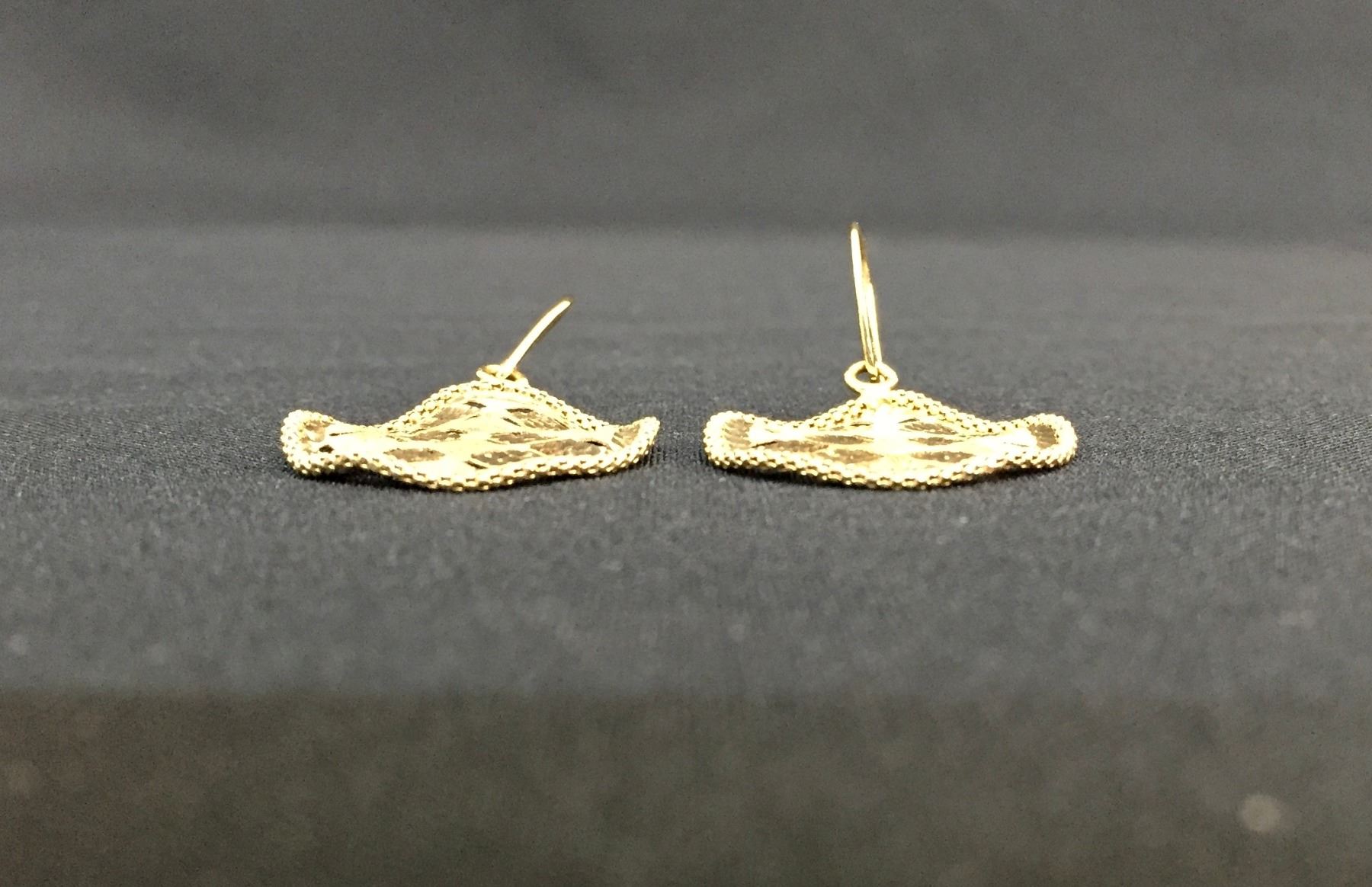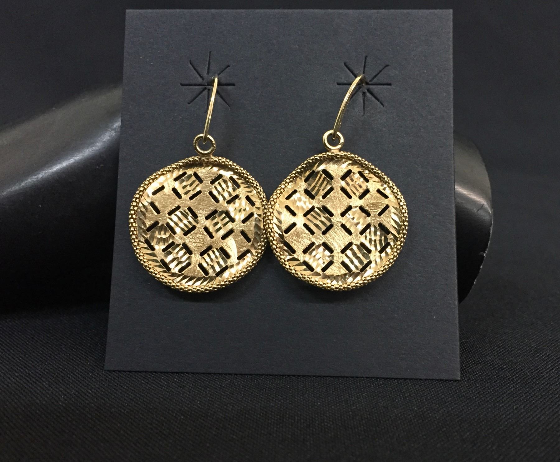 Description: Available for bidding in this lot is a gorgeous pair of 14K gold earrings featuring nice designs. Tested and marked as 14K. Maker: Unknown. Approx. Age: Fairly Contemporary. Size: Measures 1”w x 1-1/2” long. Weighs 5 grams. Condition: Good for its age, normal wear expected. Please look closely at the pictures - they are an important part of our description. Shipping: There will be a $5 handling / packaging fee for shipping this lot. The actual cost of postage will be added on top of that.