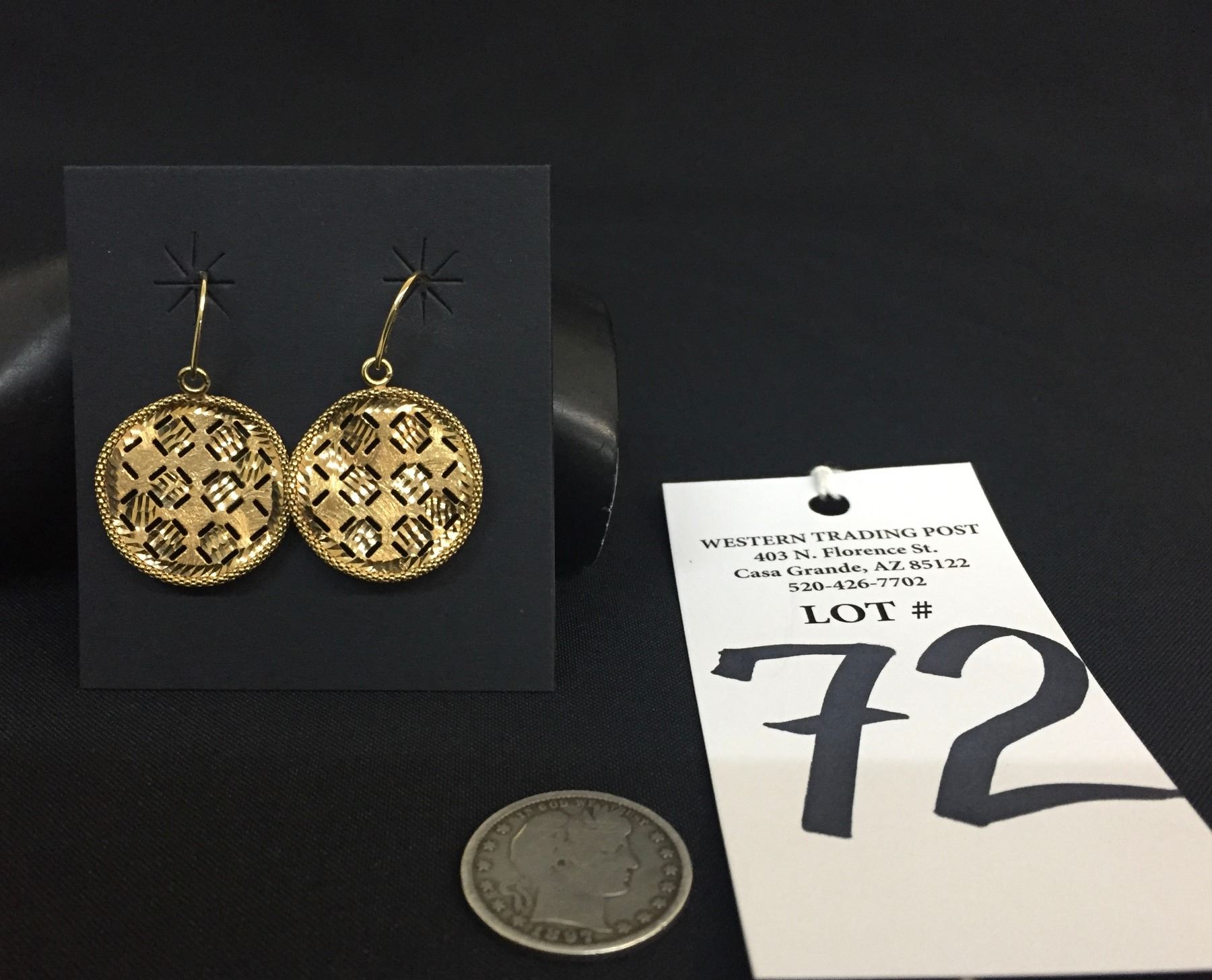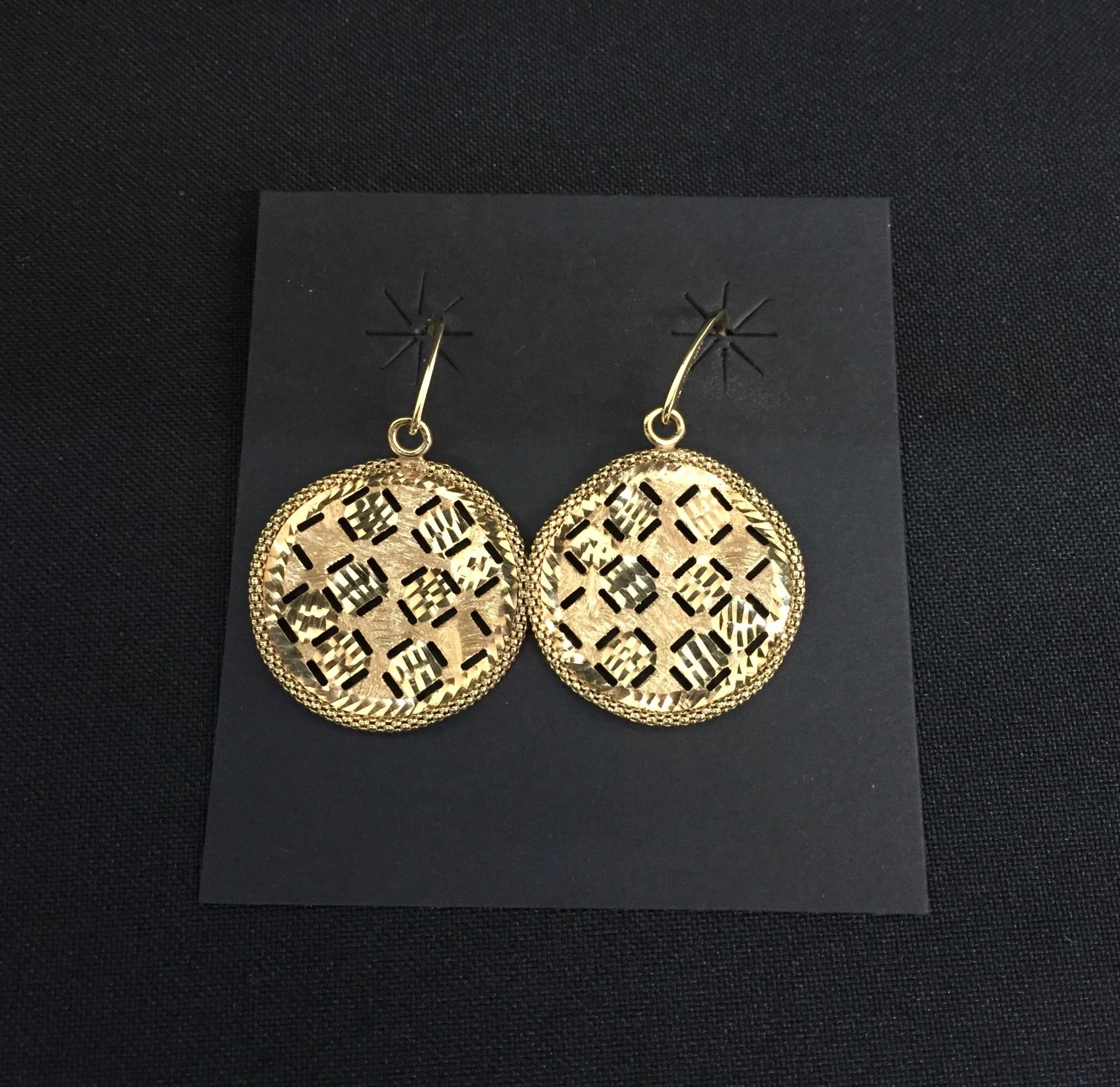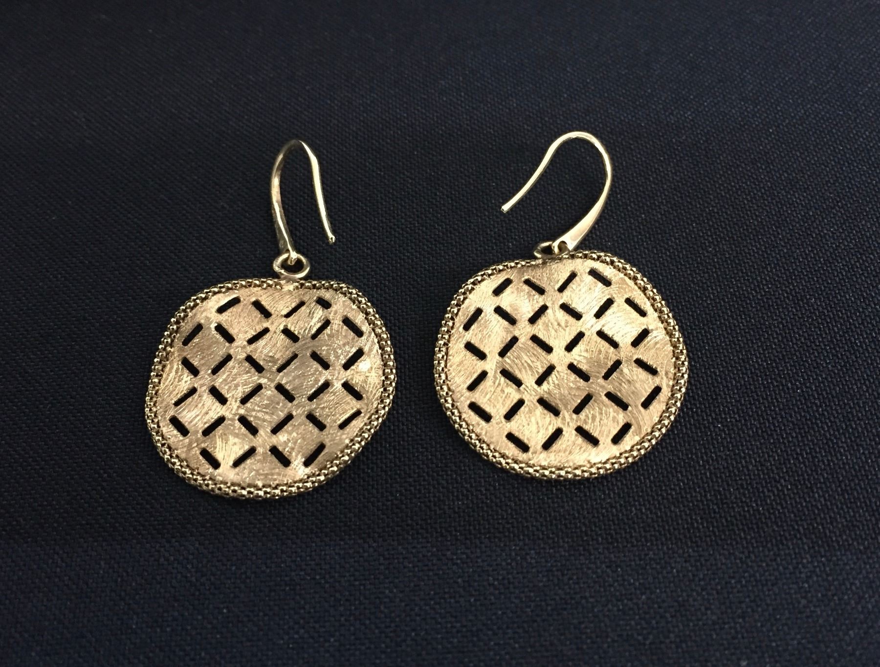Description: Available for bidding in this lot is a gorgeous pair of 14K gold earrings featuring nice designs. Tested and marked as 14K. Maker: Unknown. Approx. Age: Fairly Contemporary. Size: Measures 1”w x 1-1/2” long. Weighs 5 grams. Condition: Good for its age, normal wear expected. Please look closely at the pictures - they are an important part of our description. Shipping: There will be a $5 handling / packaging fee for shipping this lot. The actual cost of postage will be added on top of that.