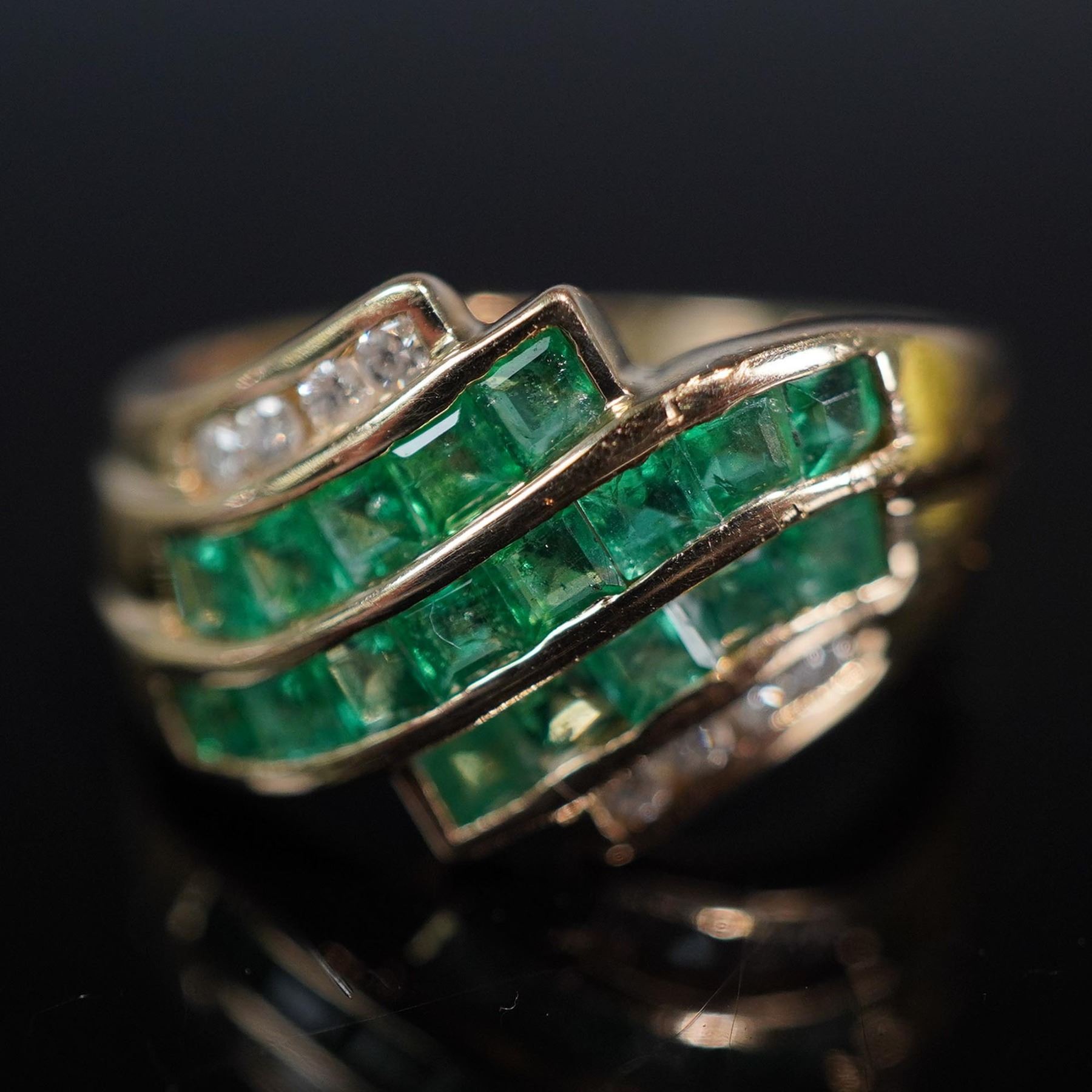 This 14kt gold ring features a vivid arrangement of 19 square brilliant-cut emeralds, channel-set in a linear formation. Interspersed between the emeralds are 18 round-cut diamonds, offering contrast and brilliance against the vibrant green stones. The band's balanced design highlights both color and sparkle, making it an elegant piece for everyday or occasion wear. The ring is stamped 14KT and is a US size 6.5.