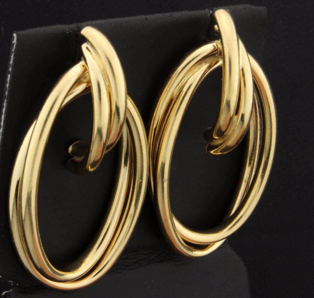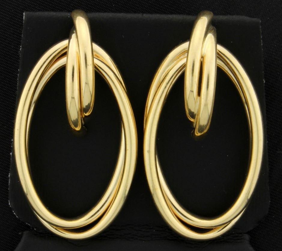 14K yellow gold, they are light weight for comfort, 1 1/2 inches long. Backs not included. 6.2g