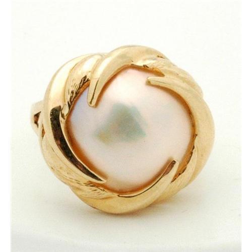 14K Yellow Gold Ring with Mabe Pearl. The size is 4.5. The lusterous large 15 mm white pearl radiates a rainbow of colors.