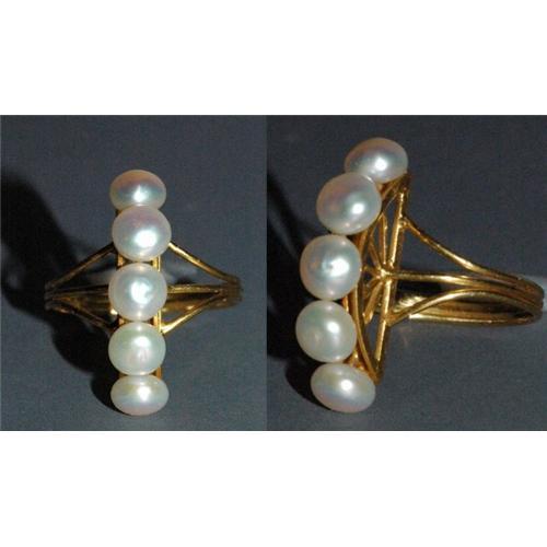 Unusual Designer high crested fresh water pearl ring. As you can see by the pictures it is a straight row of high luster pearls mounted on a 14k Gold open work 1/2 dome mounting. The ring shank is 3 fused bands that split off to hold the mounting. It is all solid 14K Yellow Gold. <p> To me, it is reminiscent of a rooster's cocks comb. In any event it is a lovely and very different ring. <p> The ring is a size 7 to 7 1/4. The pearls are all approximately 6-7 mm. Measuring from the of the highest pearl to the base of the 1/2 disc mounting it is 9mm. <p> The pearl are all in excellent shape. 2 of pearls have a natural blister but that is a product of nature and not considered damage. All the pearls have remarkable high luster. Lovely array of colors illuminate from them. The gold is in excellent shape. I doubt if this ring has ever been worn!