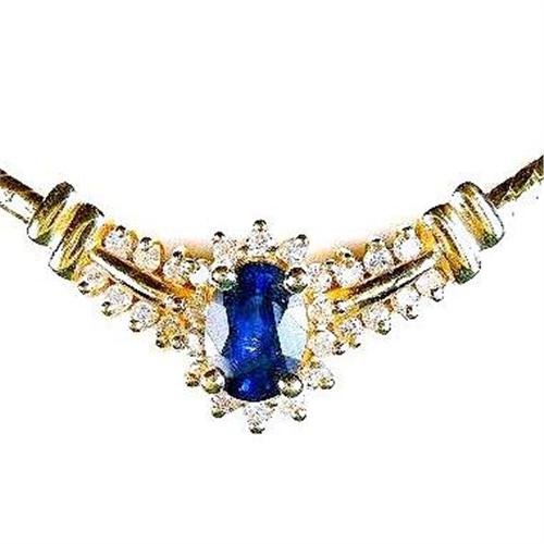 This 14k Yellow Gold Necklace is 18" long and it features a Genuine BLUE SAPPHIRE = .50 CARATS that is surrounded by 28 DIAMONDS. There is a lovely 14k Gold lobster claw clasp for security.
