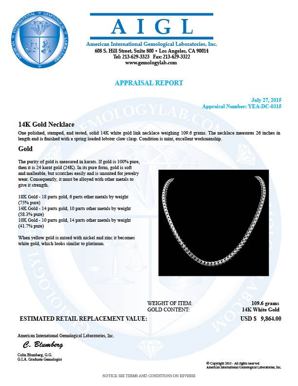Retail: $9,864.00 ****** 14K Gold Necklace ****** Metal: 14K Solid White Gold / Total Item Weight: 109.6 grams / Country Made: United States / /
