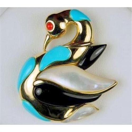 ESTATE 14k Yellow Gold Pin of a SWAN featuring Turquoises, Mother of Pearl, and Black Onyx with a Coral eye. This VERY WELL made pin measures 1 3/4" x 1 1/2" and it is SIMPLY STUNNING!