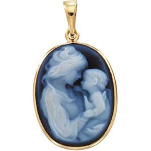 This exquisite Pendant features an Oval AGATE CAMEO of a MOTHER w CHILD. The Cameo is framed in 14k Yellow Gold and it measures 21.2mm x 16.2mm (there are 25mm in one inch). The 14k Yellow Gold bail has a nice size opening to slip a chain thru. THIS MOTHER CHILD CAMEO IS VERY WELL DONE AND VERY REASONABLY PRICED AS WELL!