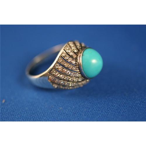 <table width="100%" border="0" cellspacing="0" cellpadding="4"><tr><td><em> Fantastic Art Deco Persian turquoise ring- .60 cts Diamonds!</em></td></tr><tr> <td width="100%"> This striking art deco ring features a large Persian turquoise cabachon with a diameter of 7/16". It has .60 carats of bright white diamonds in swirling lines, surrounding the turquoise. This ring sits .5 inches above the finger. It weighs 3.9 grams and is a size 7.25 (sizable by me or by your jeweler). </td></tr><tr> <td> </td></tr><tr> <td>Reference #: R472</td></tr><tr><td>Condition:Excellent</td></tr><tr><td>Year:c1940</td></tr><tr><td>Height:.65</td></tr><tr><td>Width:.75</td></tr><tr><td>Title:14K Gold Persian Turquoise and Diamond Estate</td></tr><tr><td>Style:Art Deco</td></tr><tr><td>Materials:14K white gold, diamonds, persian turquoise</td></tr><tr><td>Location:Minneapolis, Minnesota</td></tr></table>