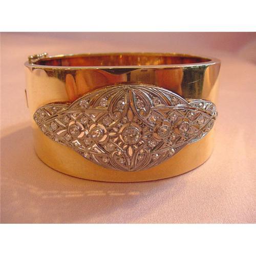 </font></strong>Exquisite 14K yellow gold wide bangle bracelet with large filigree platinum diamond top.
