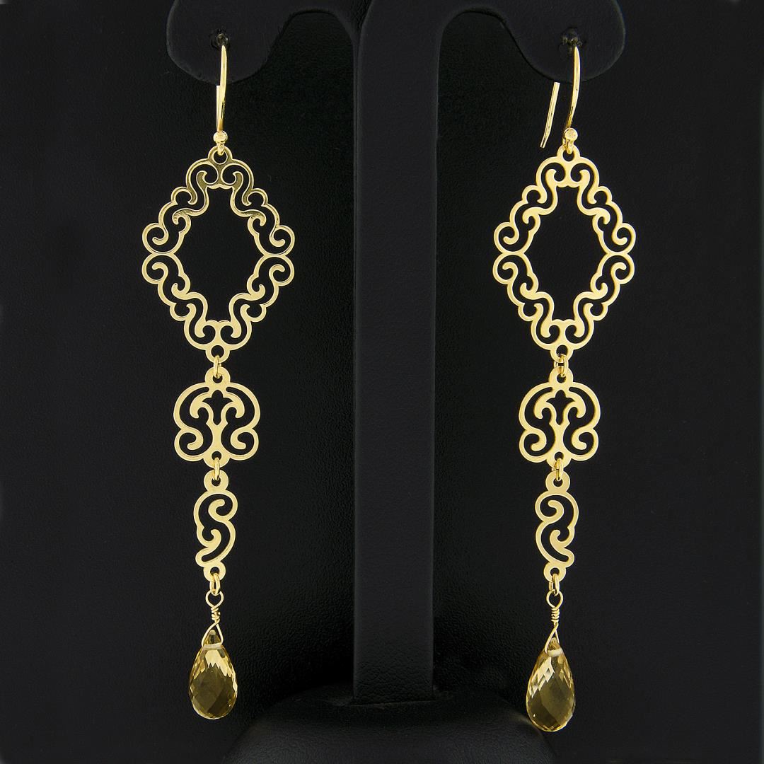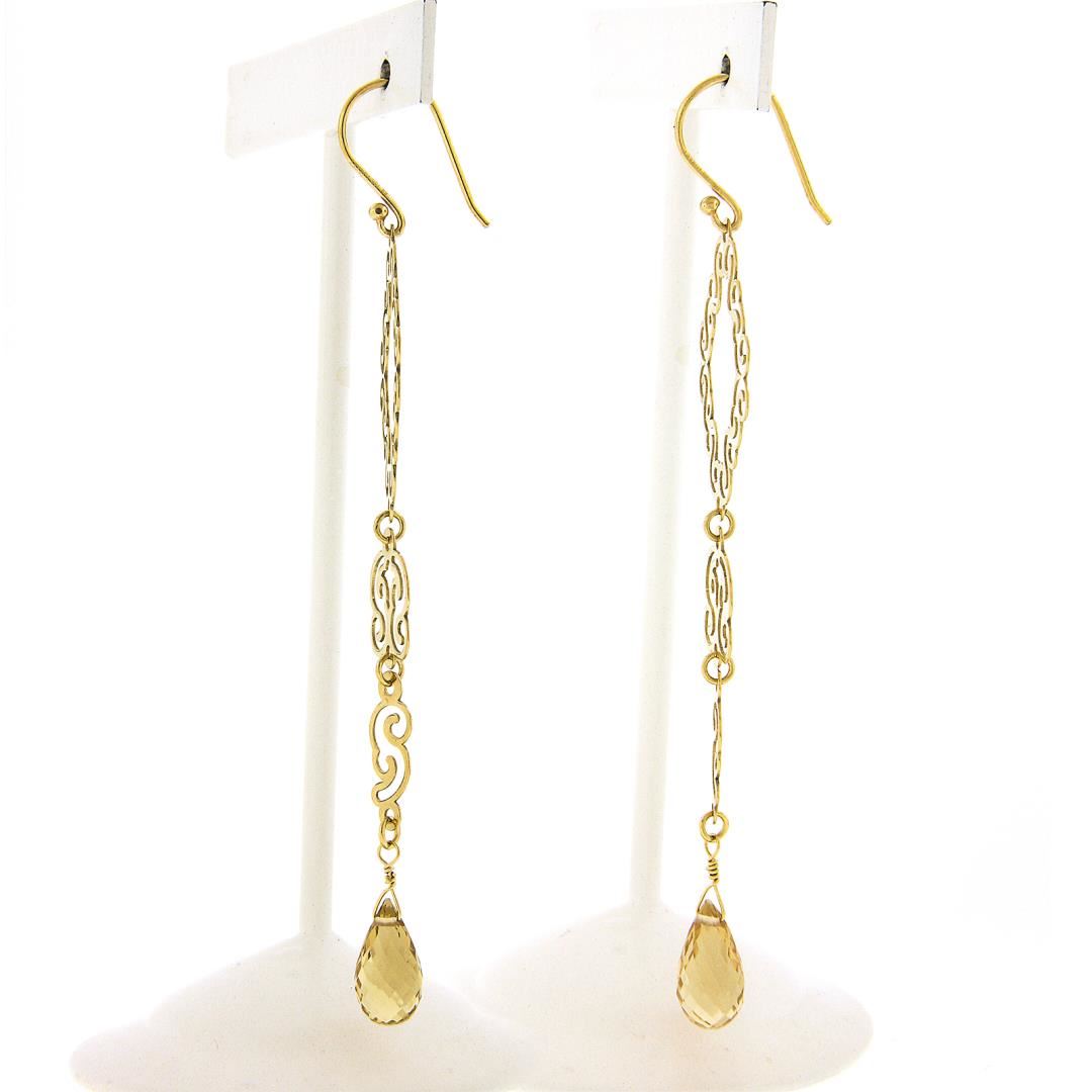 A solid 14k yellow gold dangle earrings, with 2 briolette cut natural citrines (12.3x6.2mm each). The earrings measure approximately 85.50x19mm and weigh a total of 3.98 grams.