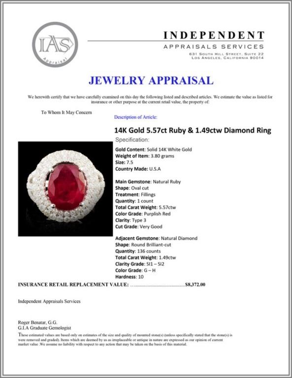 Regarding Appraised Jewelry and Loose Stones - Auctionfarm sends them out to a third party for Retail Replacement Value Appraisals, which are the most common. These types of evaluations are written for insurance needs. This would be the cost to replace the jewelry with an item of equal quality and kind, considered to be the current market price or the replacement value. This type of appraisal is done to protect you in the event of damage or loss of a valuable item. Our appraisals are conducted by independent 3rd Party appraisal firms that utilizes Certified GIA Gemologist. Appraisals should be used for verification of gemstone and/or metal weight, size, and grade only, not actual value. Appraisal value should be considered for insurance purposes only, not actual value, as price varies greatly from retail locations thru out the world. Items should not be purchased with the expectation to resell for appraisal price, or for profit.