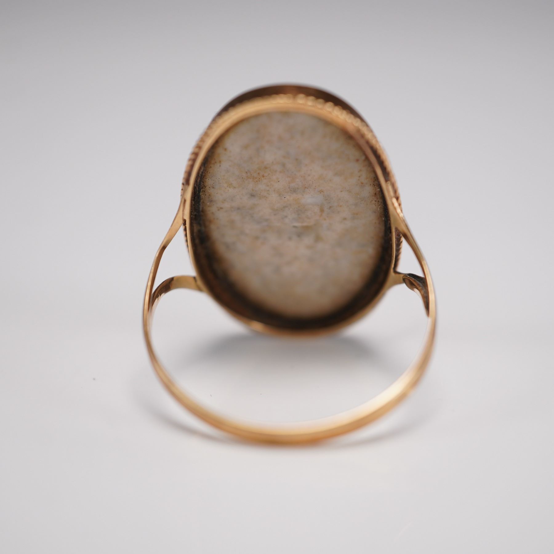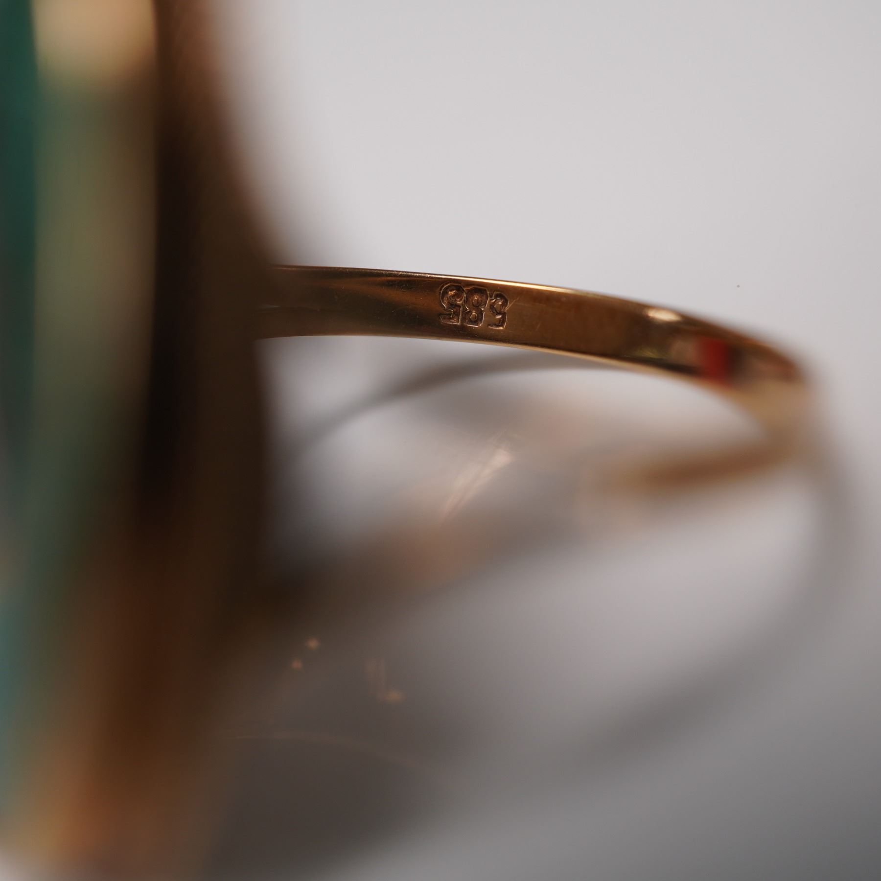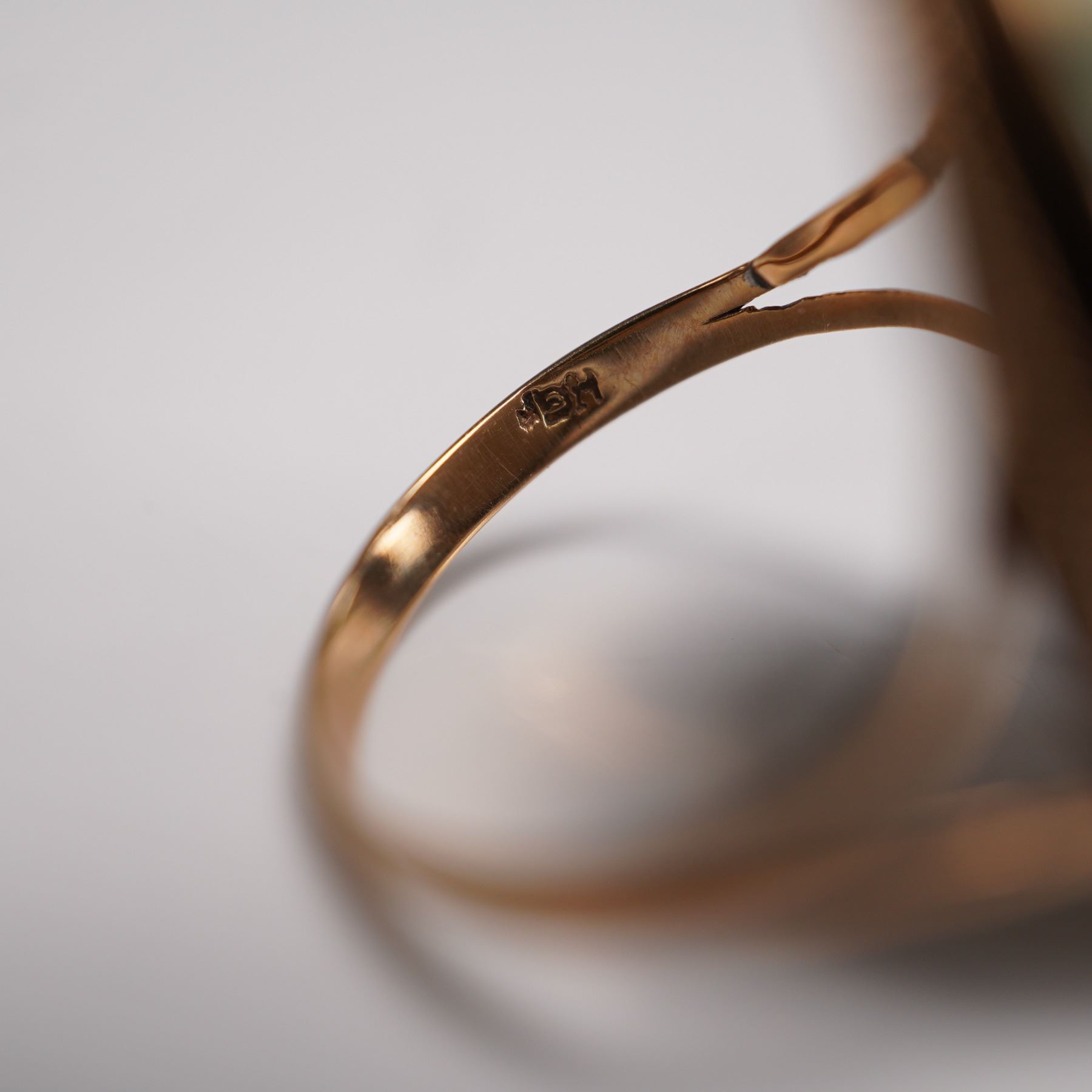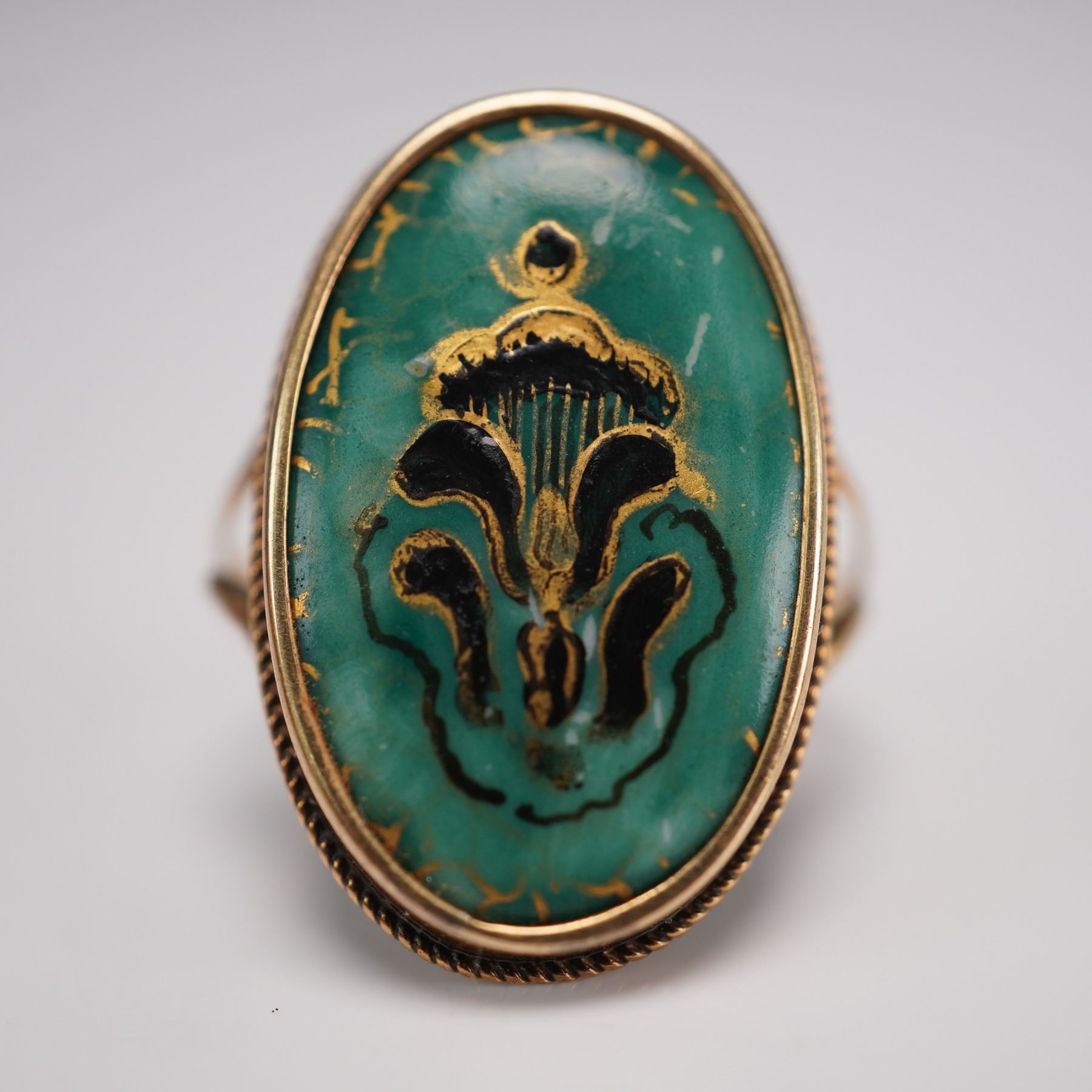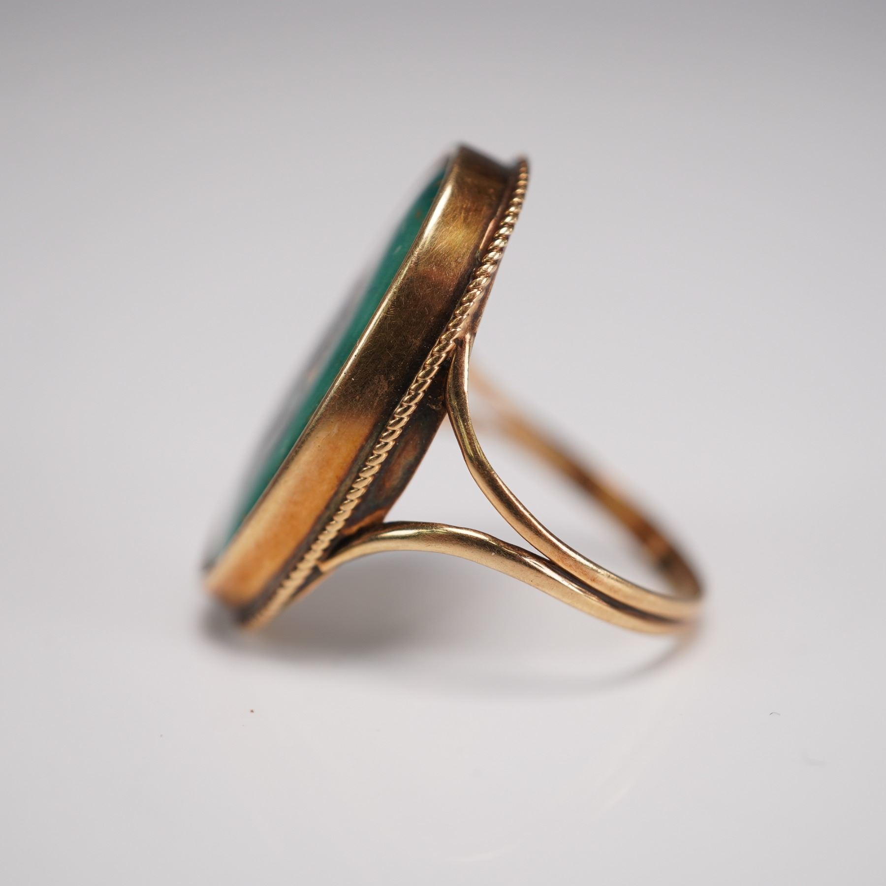 A bold 14k yellow gold ring featuring a large oval green stone cabochon, finely decorated in black and gold with a stylized foliate or urn motif. The cabochon is set in a milgrain-edged bezel atop a split shank mount, stamped 14K to the band. A vintage design with artisan character, blending classical symbolism and statement scale. Size 8.5. Total weight 3.51g.