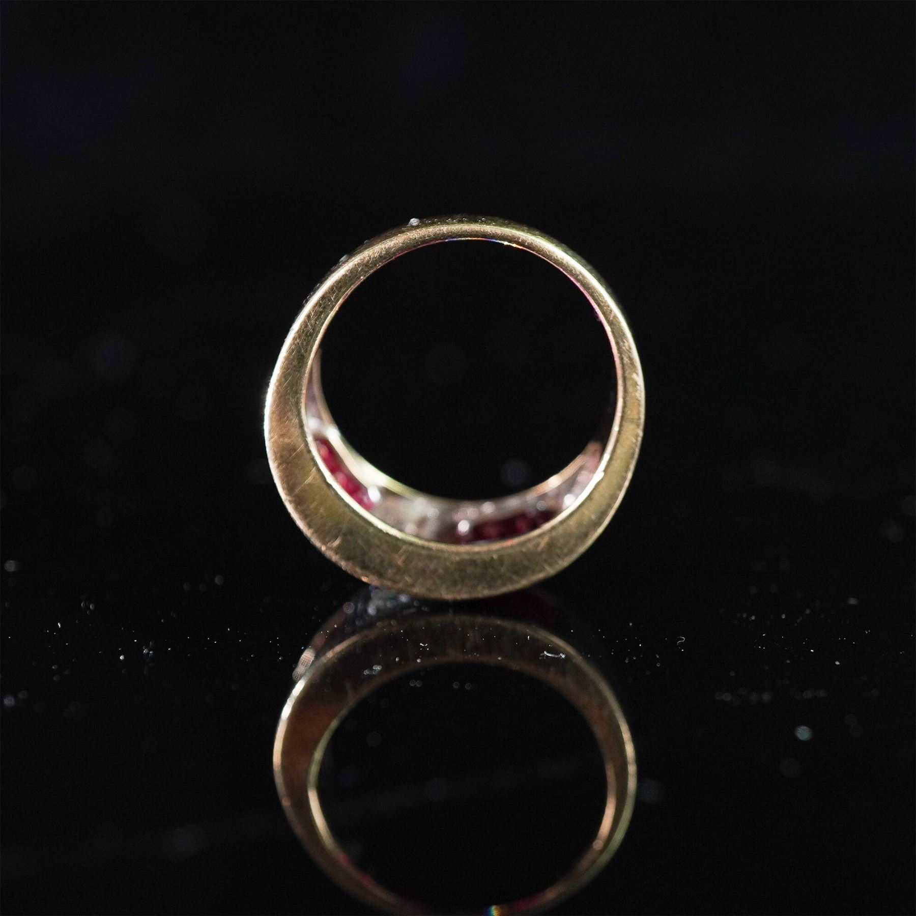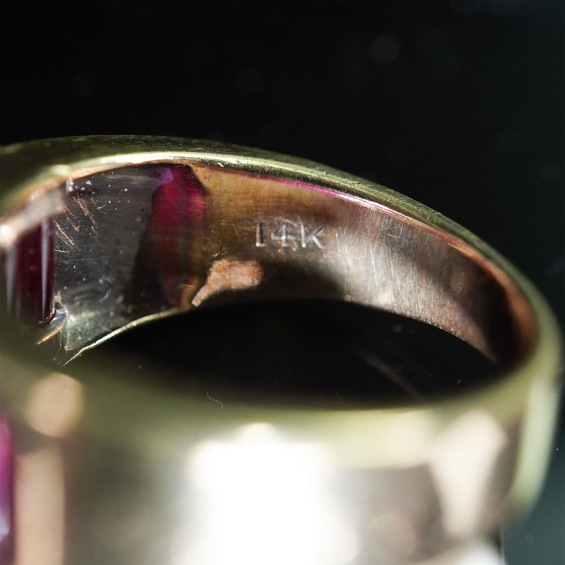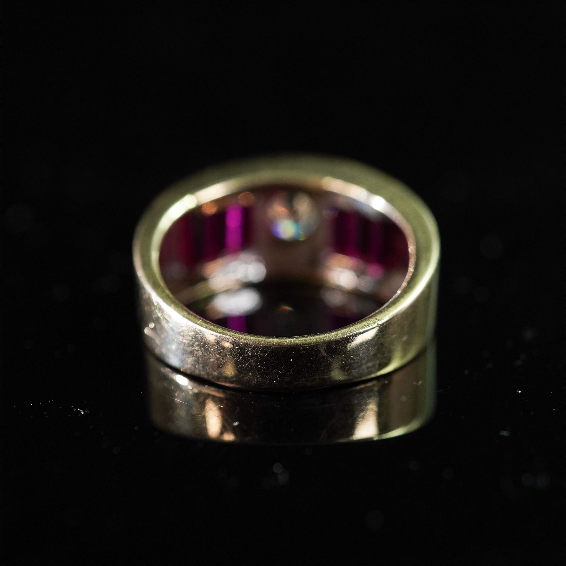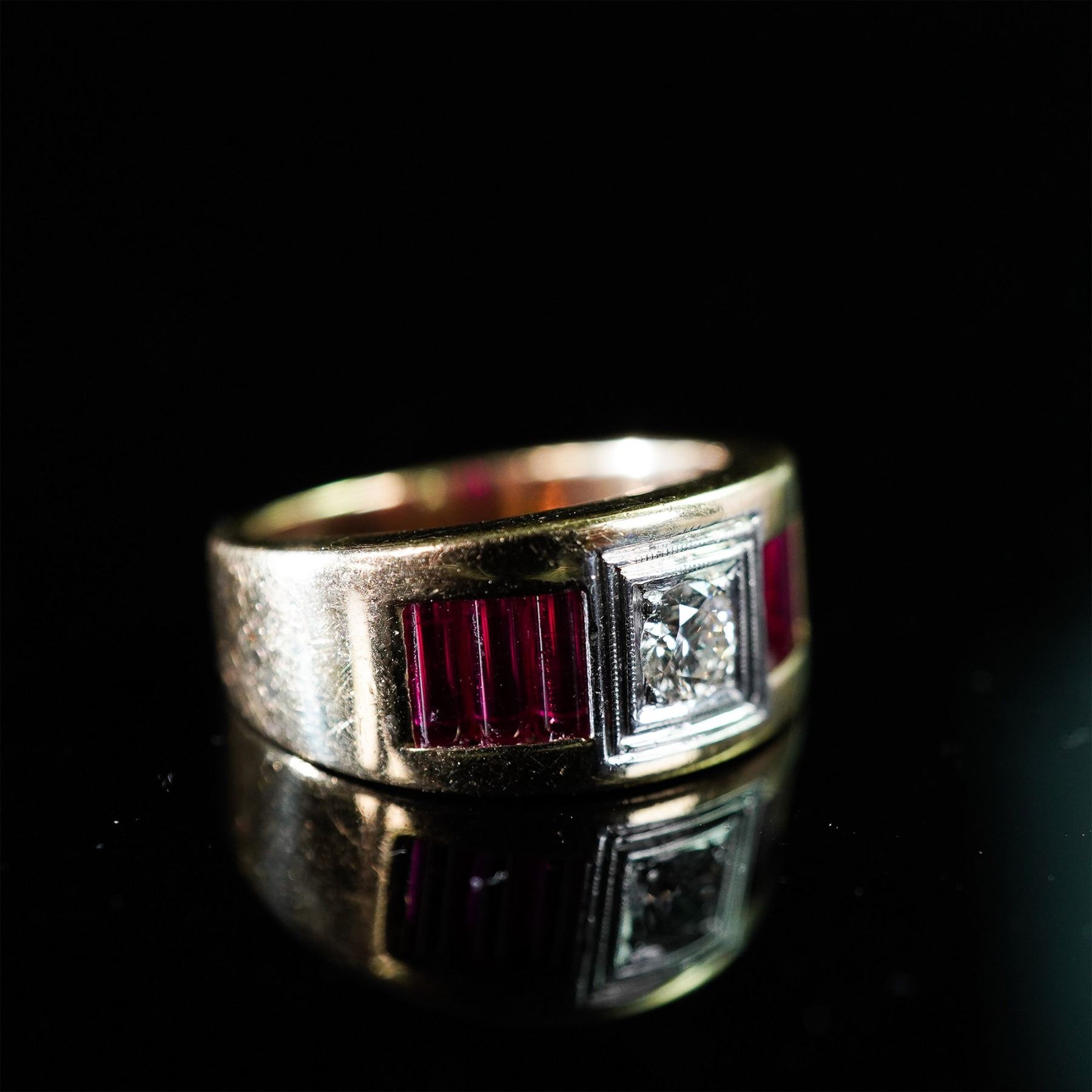 A bold and sophisticated 14K yellow gold ring featuring a centrally set round brilliant-cut diamond, estimated at approximately 0.25 to 0.30 carats. The diamond is bezel-set in a square white gold frame that enhances its brilliance and provides a striking contrast against the rich yellow gold band which is marked 14K on the inner band. Flanking the center stone on both sides are three channel-set baguette-cut rubies per side—six in total—estimated to weigh approximately 1.25 carats. The rubies exhibit a deep, vibrant red hue that pairs beautifully with the warmth of the gold and the sparkle of the diamond. Weighing 7.53 grams in total, this ring has a substantial, masculine profile, making it an excellent statement piece or a unique alternative to a traditional men's wedding band. The quality craftsmanship and eye-catching gemstone arrangement evoke a mid-to-late 20th-century design aesthetic, with timeless appeal. This ring is unmarked for total carat weight but has been carefully examined for gemstone estimates. A standout piece for collectors of fine vintage jewelry or those seeking a bold, gem-set gold ring. Total Weight: 7.53 grams Metal: 14K yellow gold Diamond: 0.25"0.30 carats (round brilliant cut) Rubies: 1.25 total carat weight (6 baguette cuts) Ring Size: 7.5