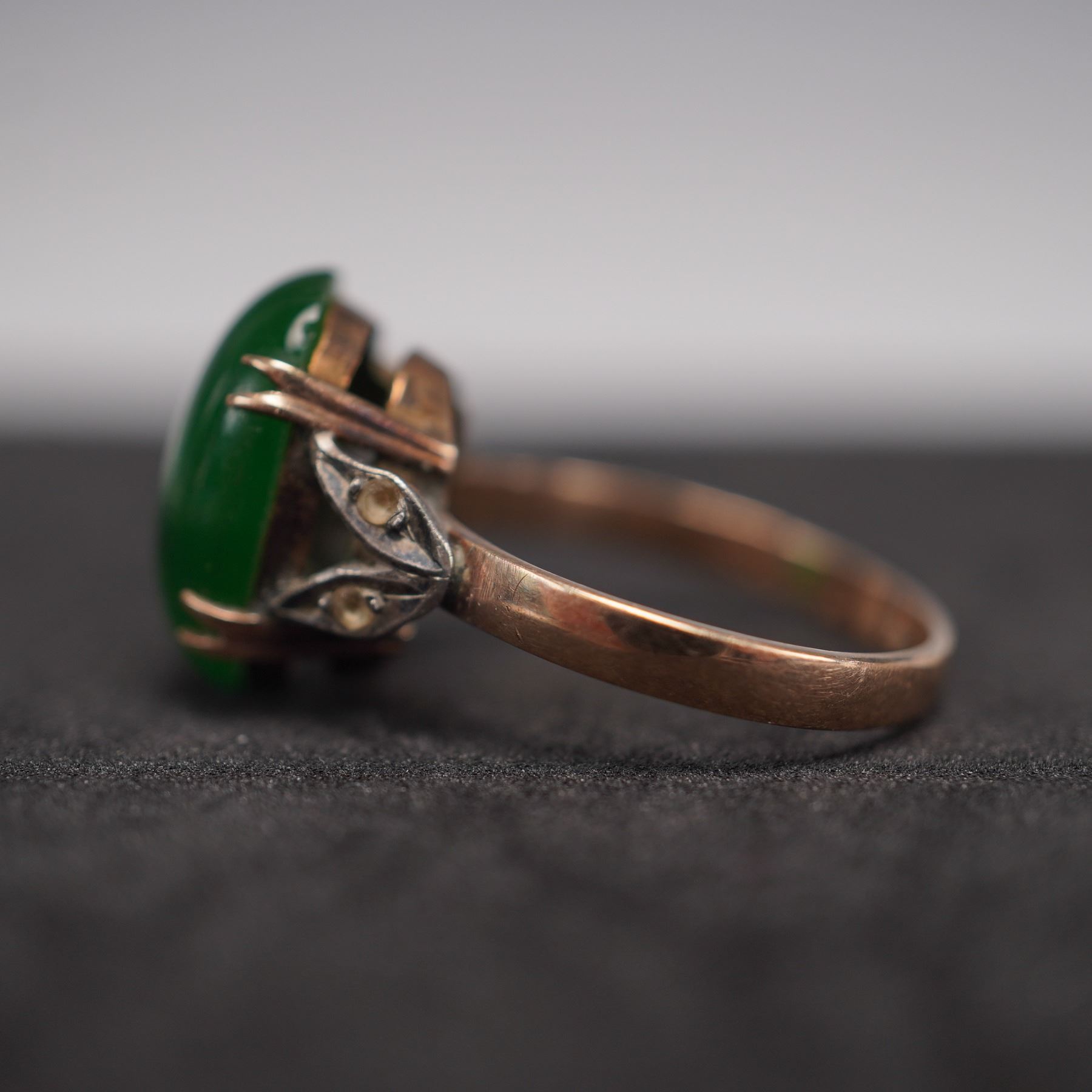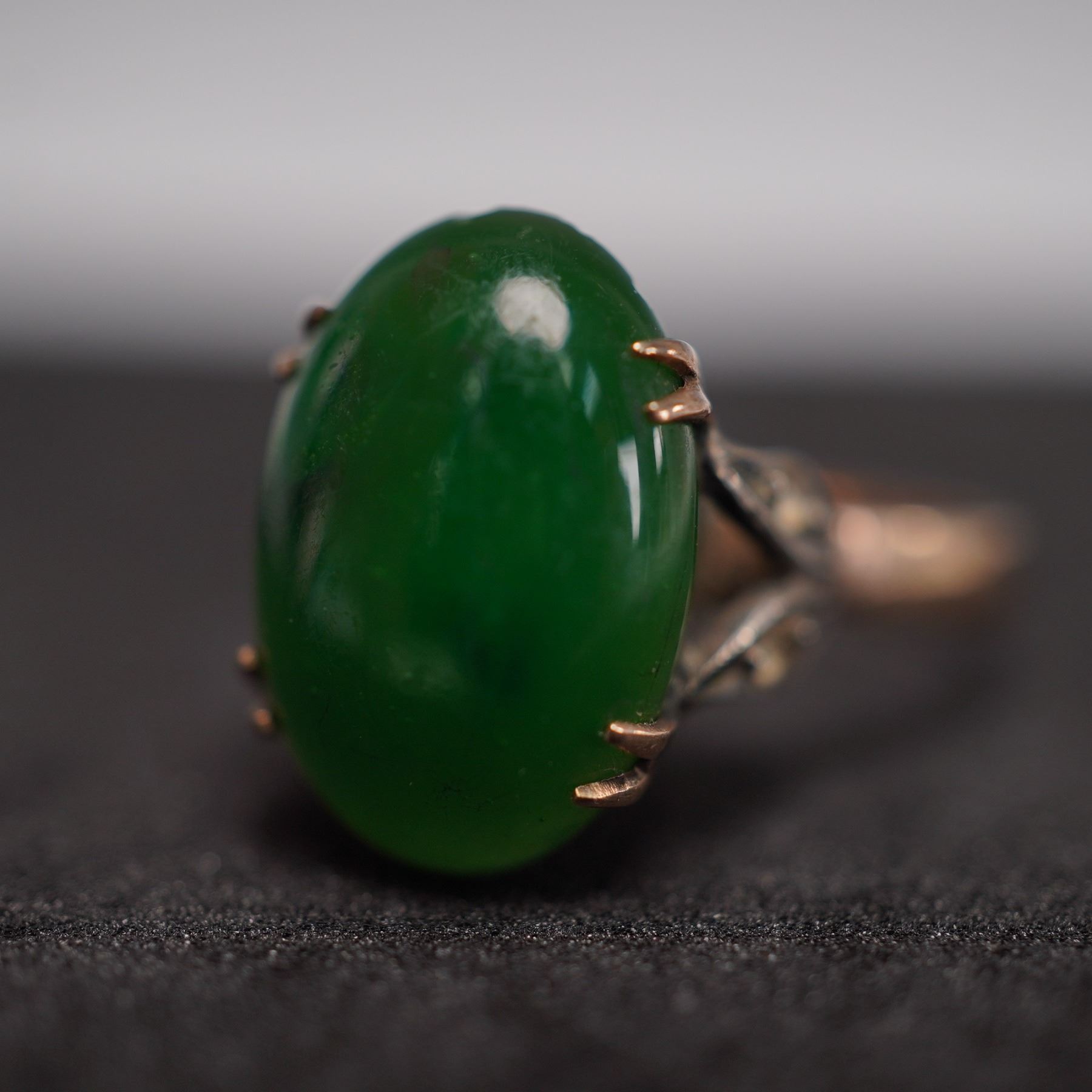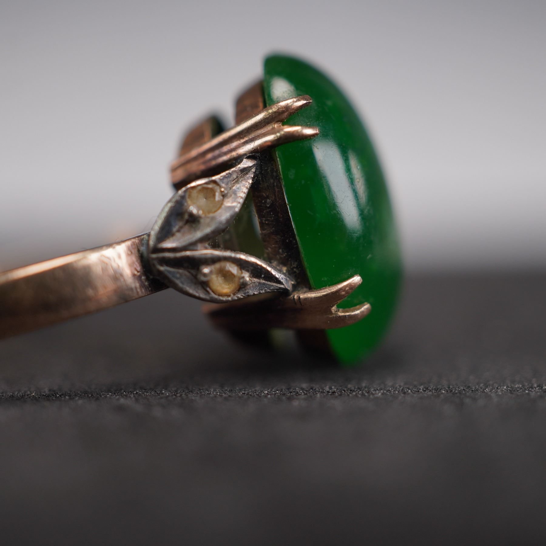 A striking vintage ring set with a vibrant green jade cabochon in a raised six-prong setting, mounted in warm 14k yellow gold. The shoulders feature an openwork foliate design with applied leaf accents and subtle patina, lending Art Deco-inspired charm. Inner band stamped 14K. Size 6.5. Total weight 2.8g.