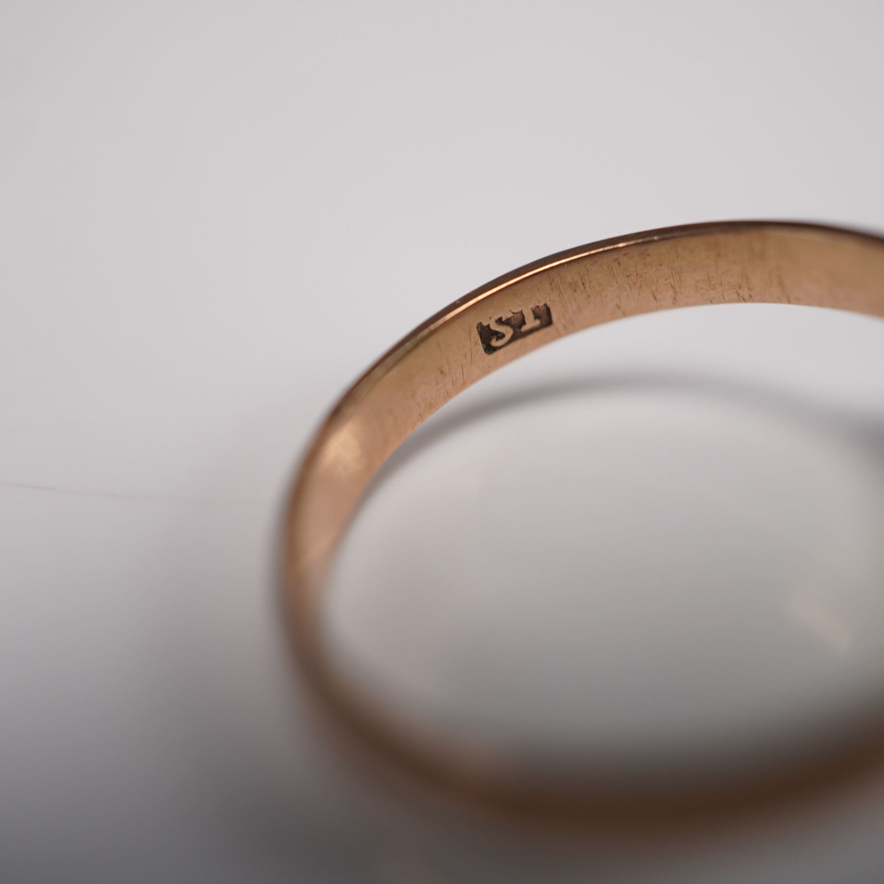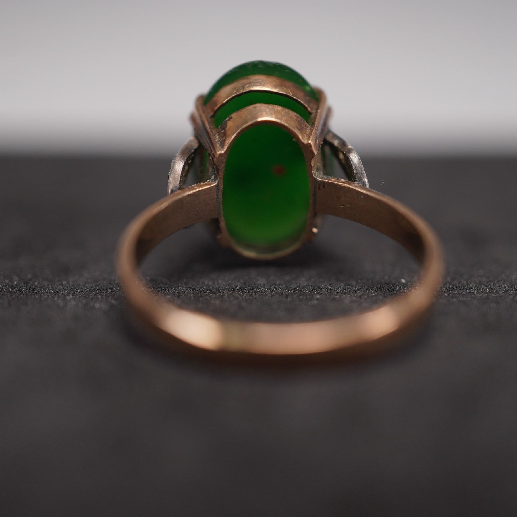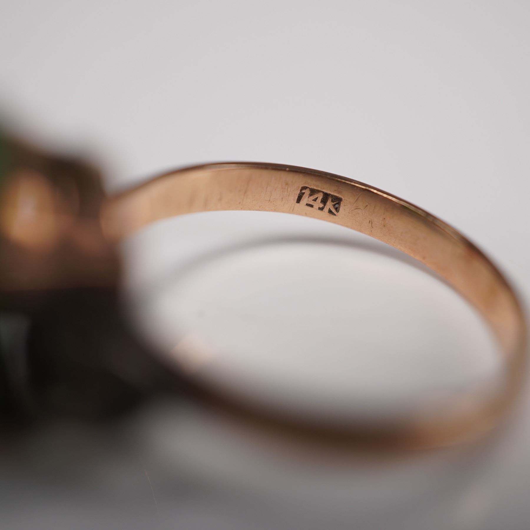 A striking vintage ring set with a vibrant green jade cabochon in a raised six-prong setting, mounted in warm 14k yellow gold. The shoulders feature an openwork foliate design with applied leaf accents and subtle patina, lending Art Deco-inspired charm. Inner band stamped 14K. Size 6.5. Total weight 2.8g.