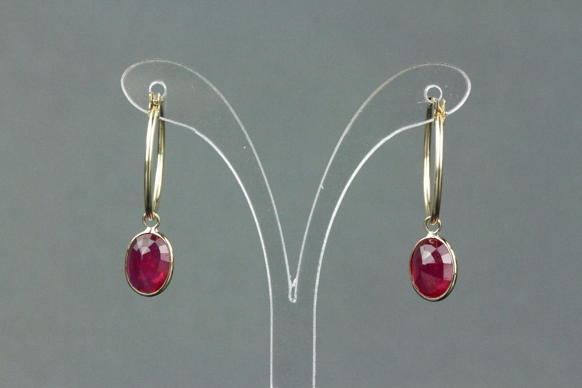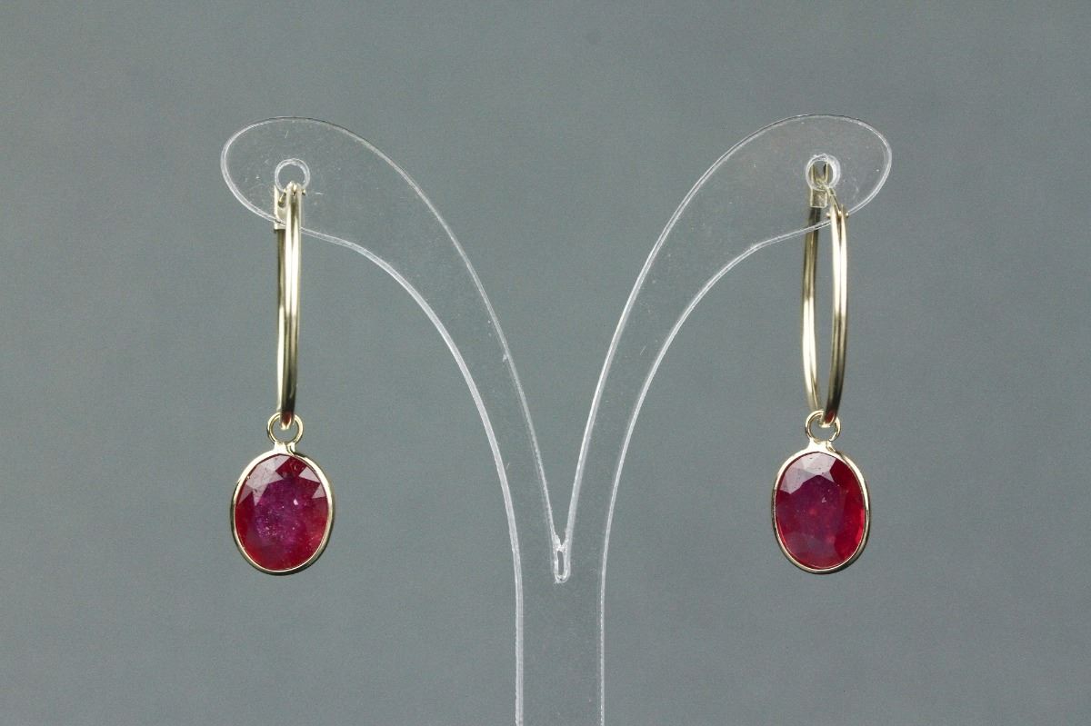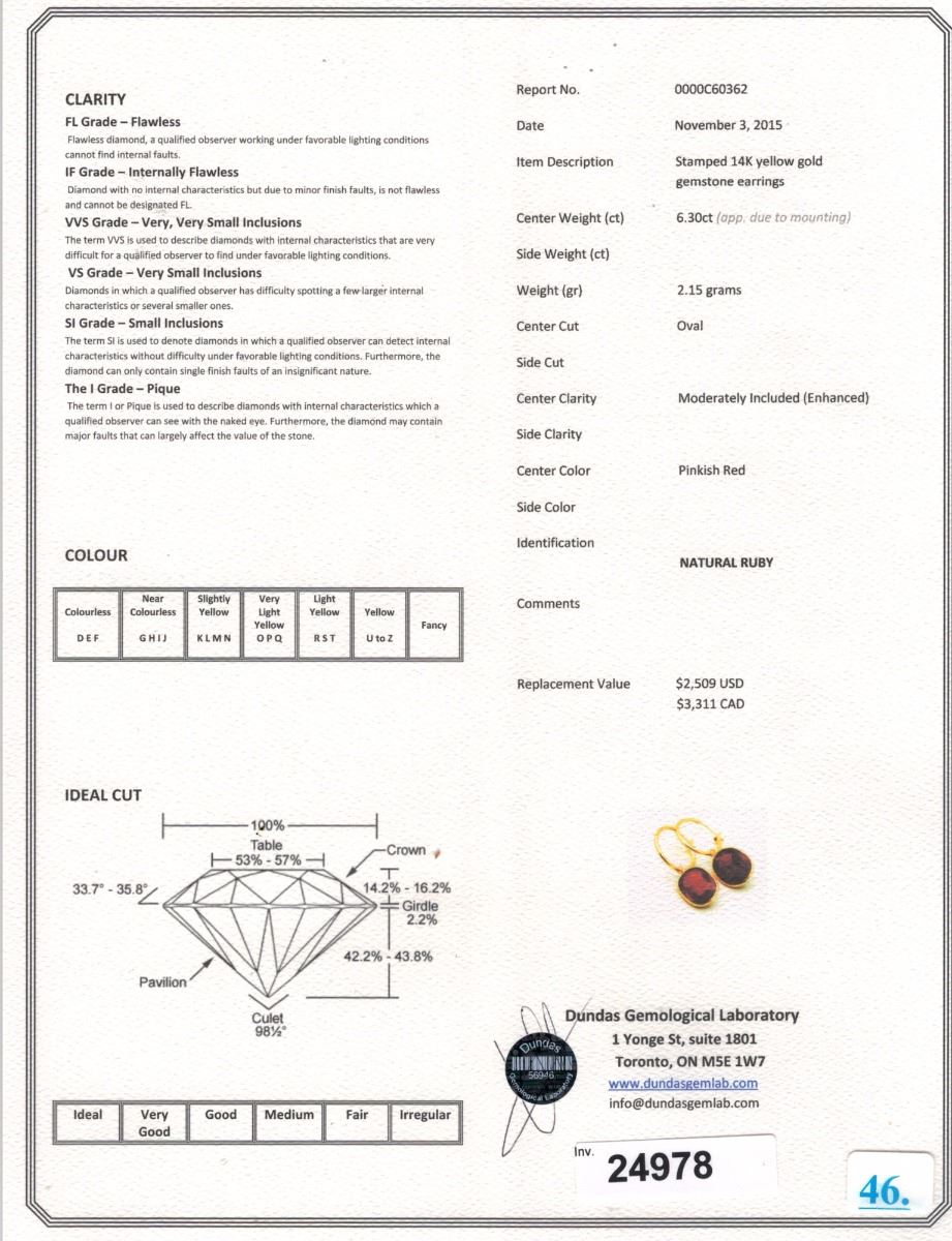 Stamped 14K yellow gold gemstone earrings; with 6.30ct oval shape pinkish red natural ruby; 2.15 grams; certified replacement value $3311