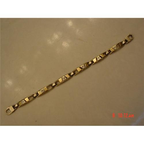 This beautiful two tone modernistic bracelet has six gold links and a silver clasp. The center piece of each link is silver and has a 2mm diamond set in the center. It is flanked by two gold pieces. These three pieces glide up and down the link separately. A spring hook securely closes the bracelet. On the back of the closure loop is the 14K mark and a mark which looks like a capital M with a small letter on the top which I can't make out. This bracelet weighs 28 gms and could use a good polishing, but otherwise it is in excellent condition!