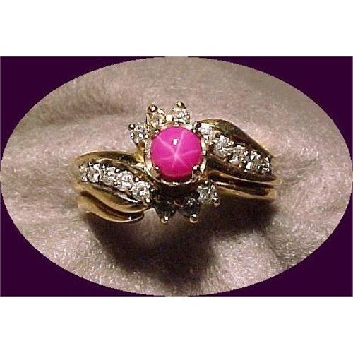 <tr><td>Title:14K Gold Star Ruby Ring with 16 Diamonds</td></tr>