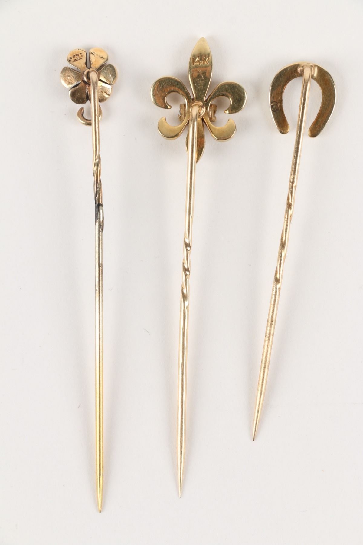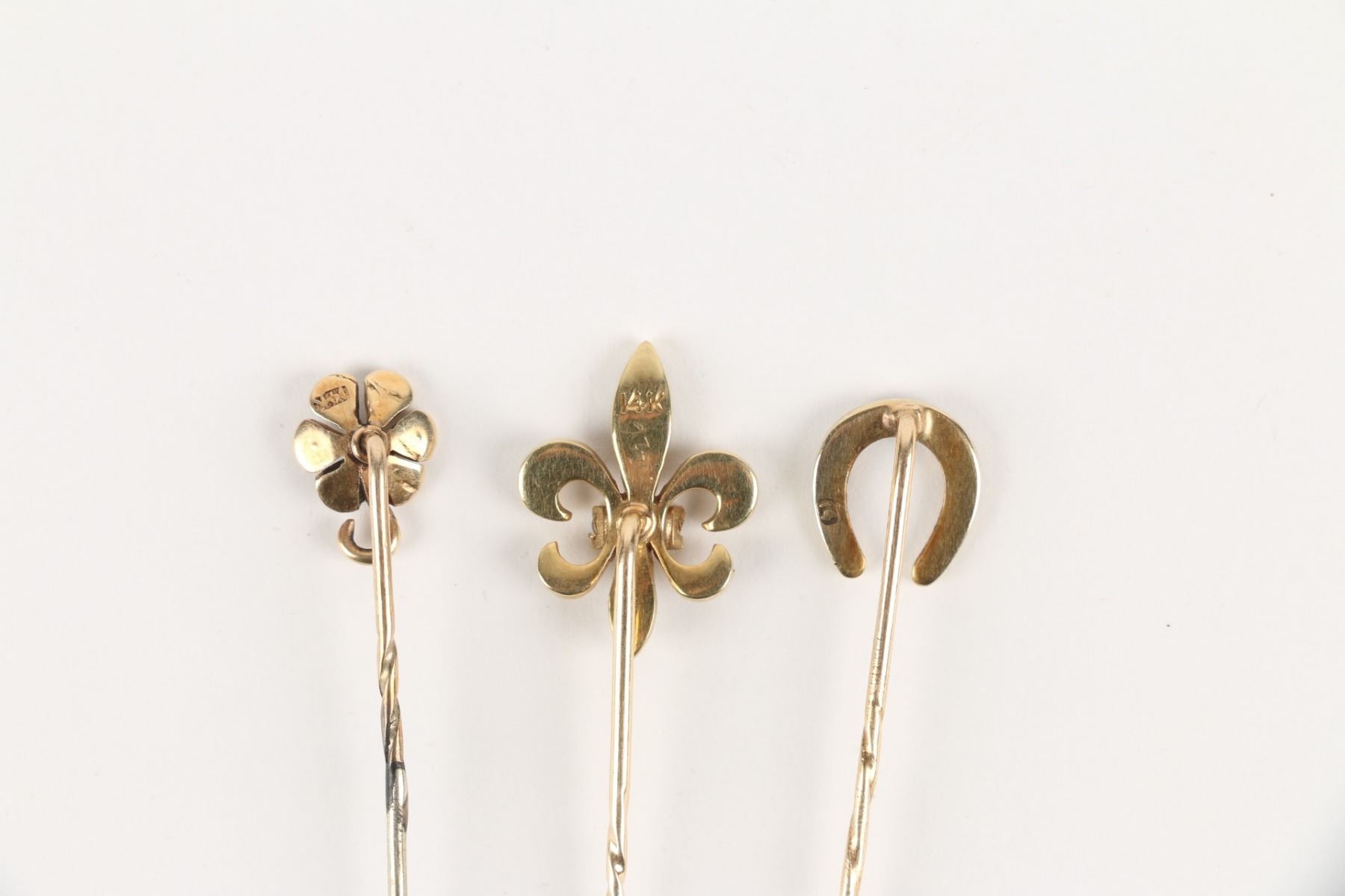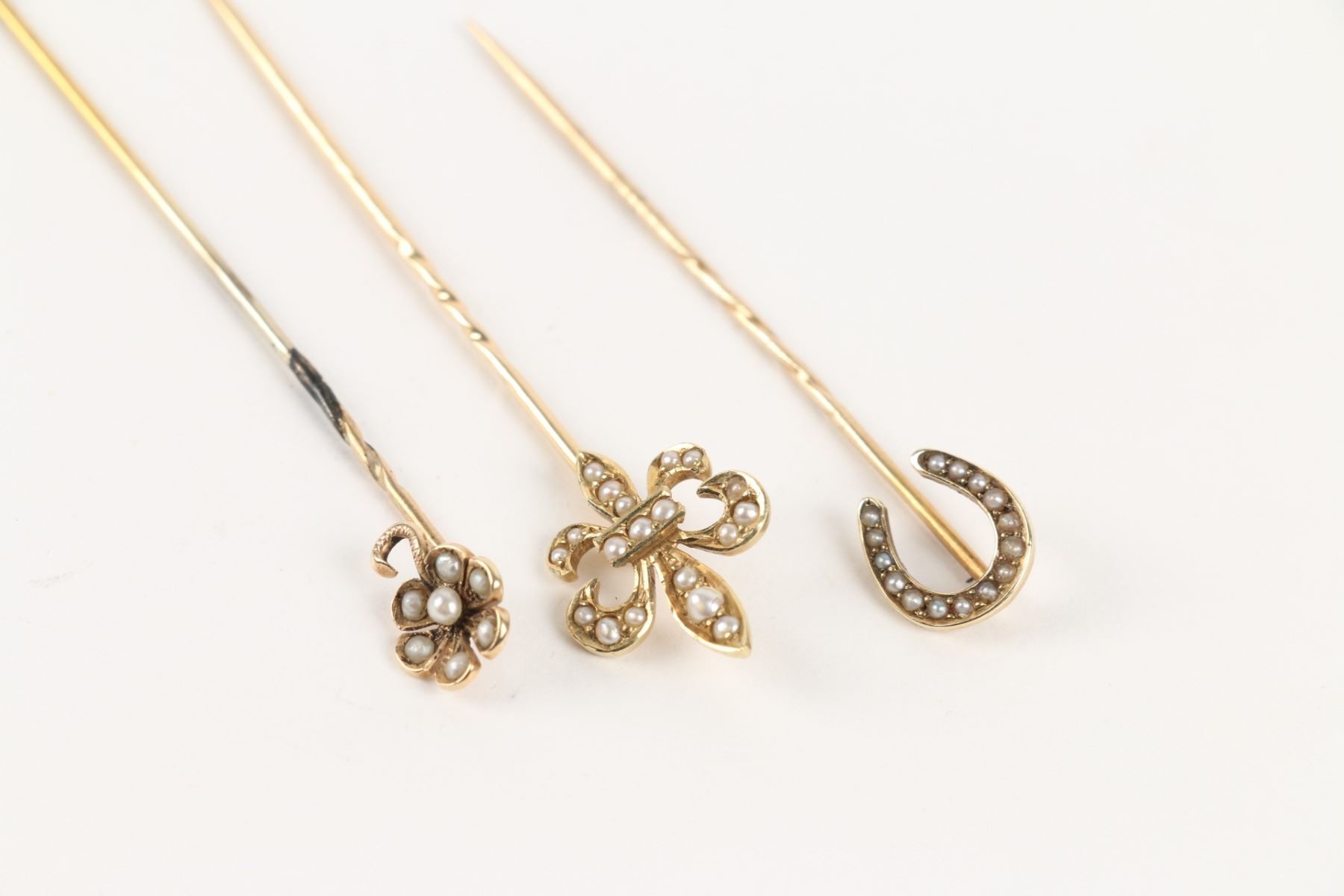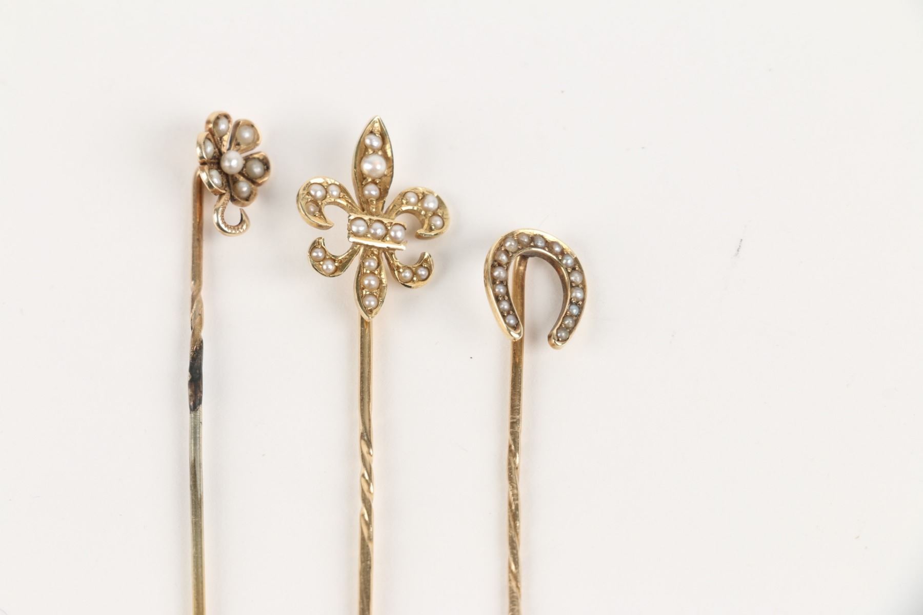 Lot 29 - Three (3). Edwardian. Each set with seed pearls. Individually hallmarked, "14K". Combined gross weight, 4.78g. Longest, 2.5". $200-300.