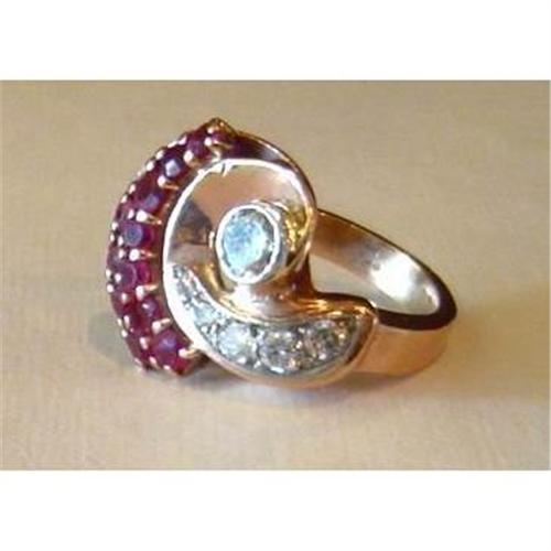 <tr><td>Title:14K Gold Swirl Ring With Diamonds & Rubies</td></tr>